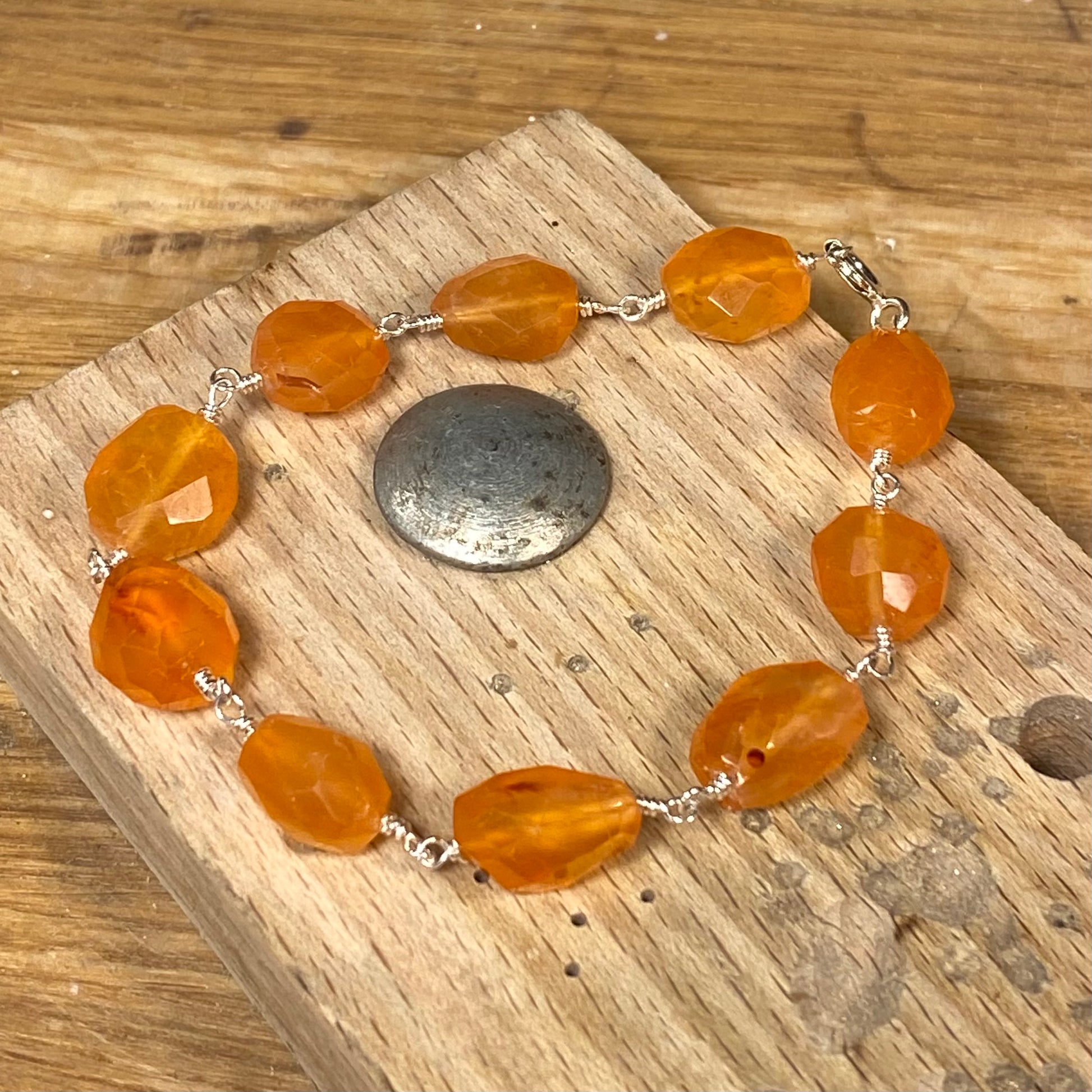 Facetteret carneoler sat på sølvtråd. Stenene er mellem 10 og 14 mm. Armbåndet er 19 cm langt