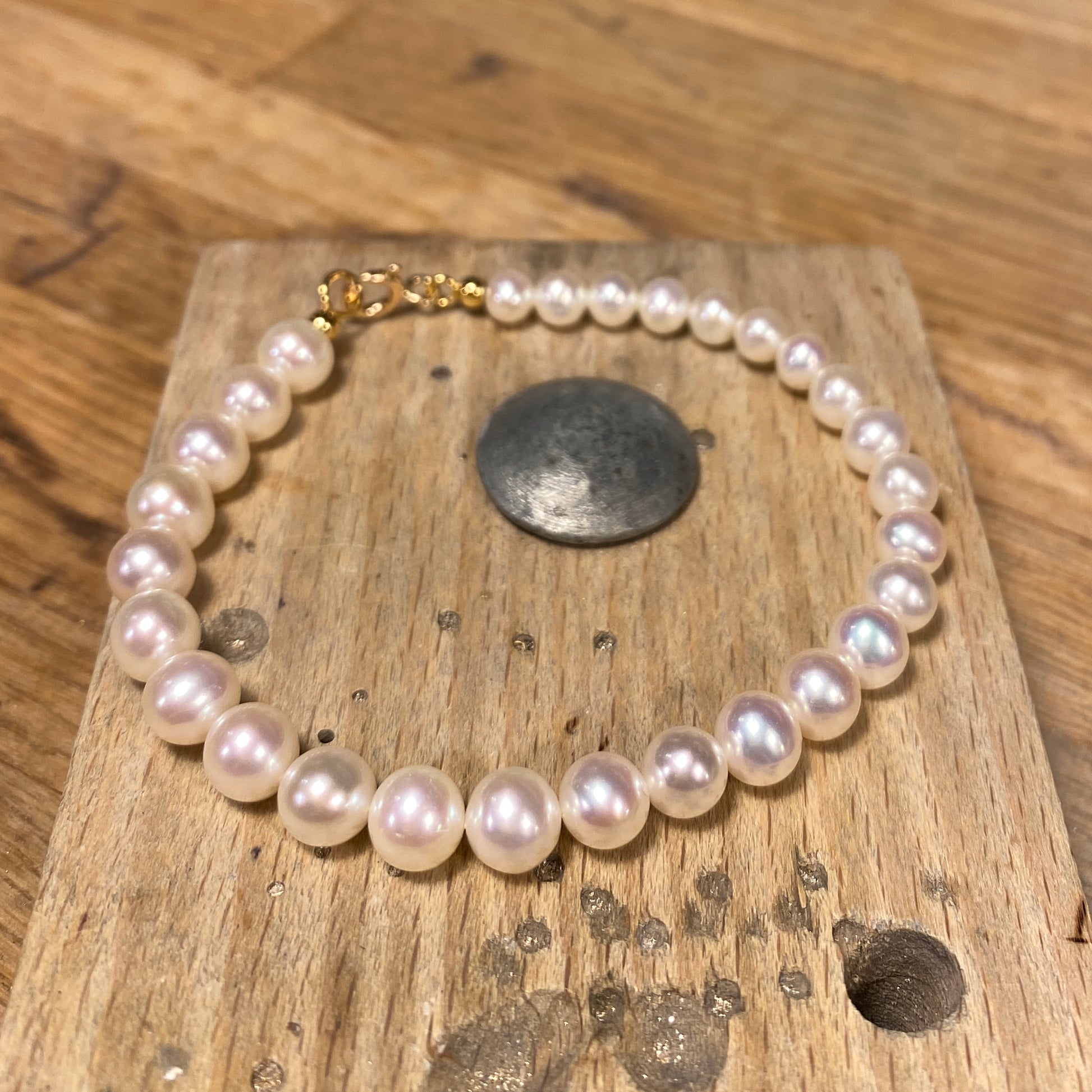 Perlearmbånd i forløb. Perlerne er fra 5 mm til 6,7 mm