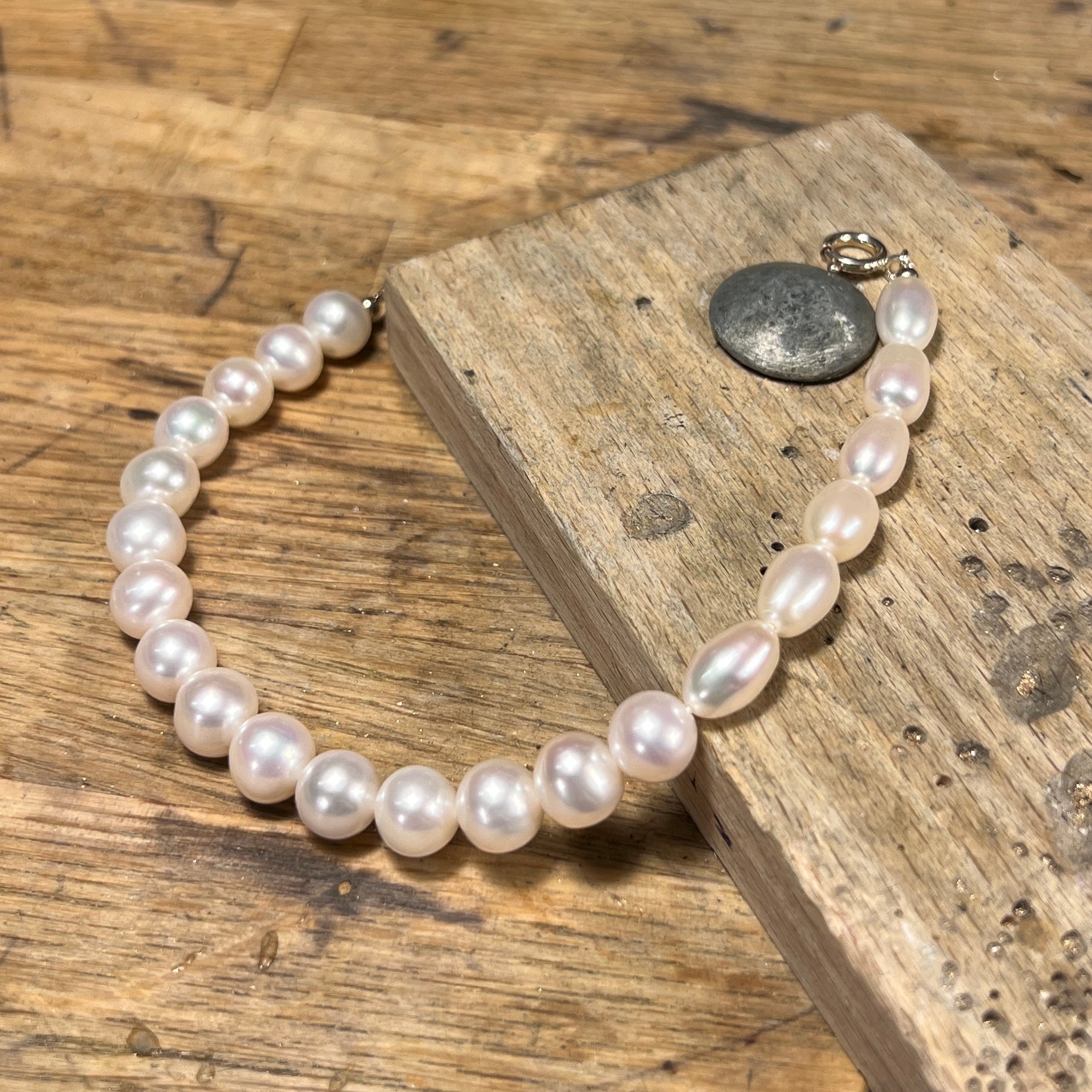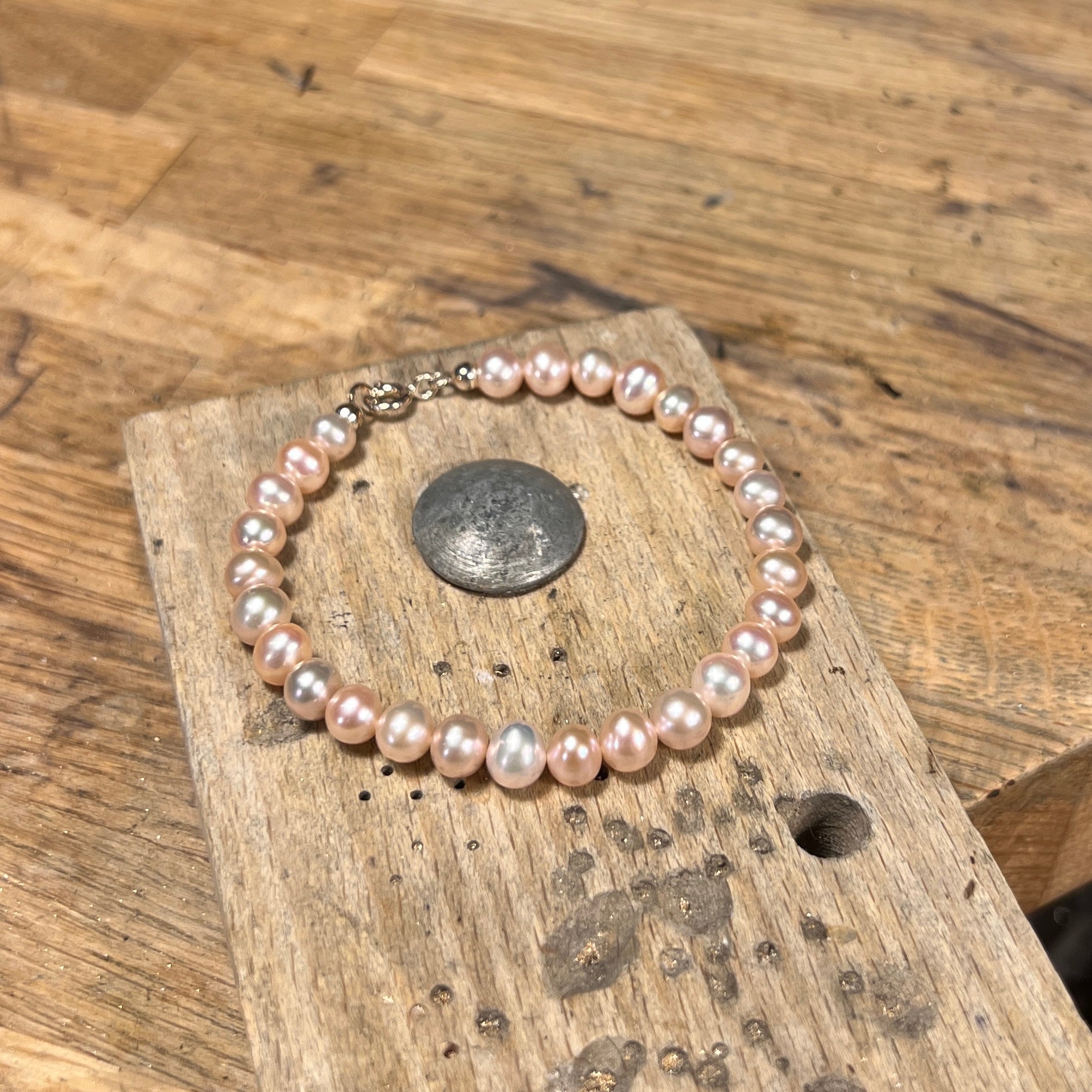 Rosa/ferskenfarvet ferskvandsperler. Armbåndet er 17,5 cm og har sølvlås.