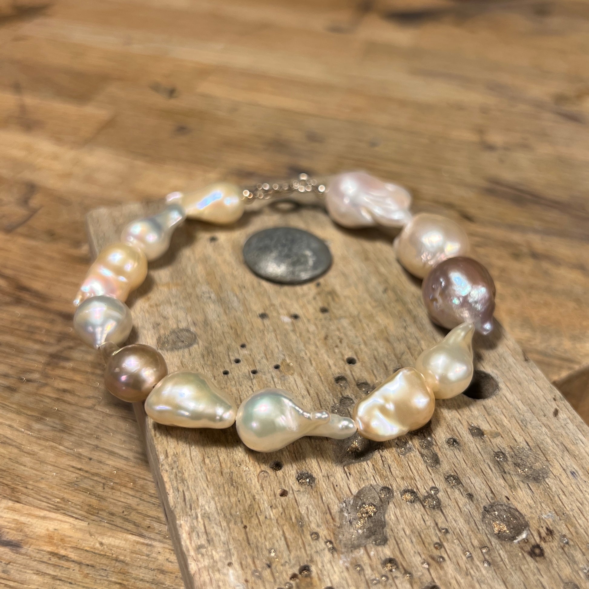 Forskellige ferskvandsperler - naturlige farver i mix. Armbåndet er 21 cm langt og har sølvlås.