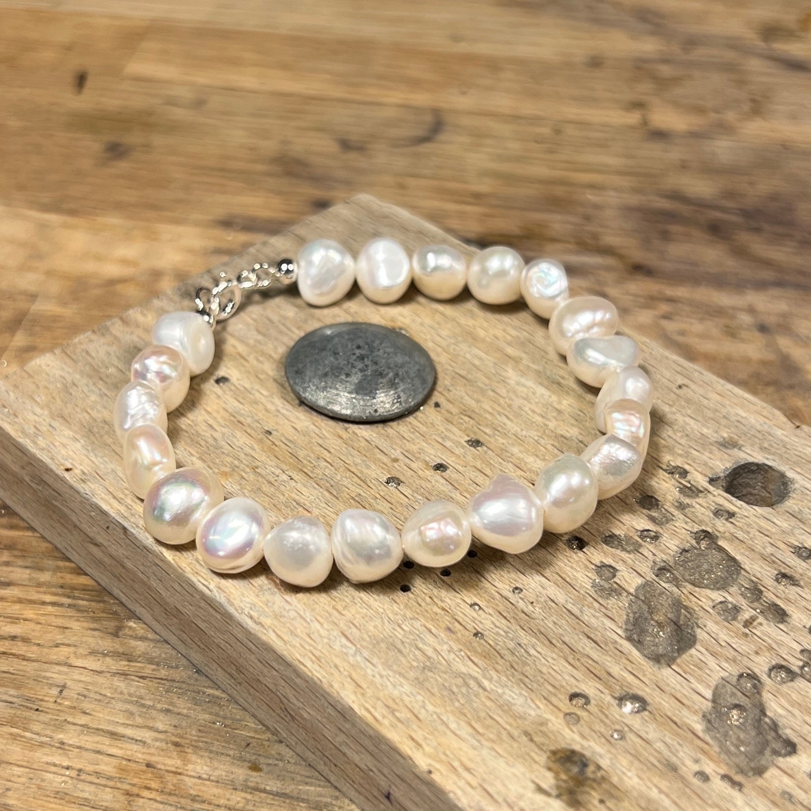 Fersk.vandsperler med sølvlås. Armbåndet er 18 cm langt