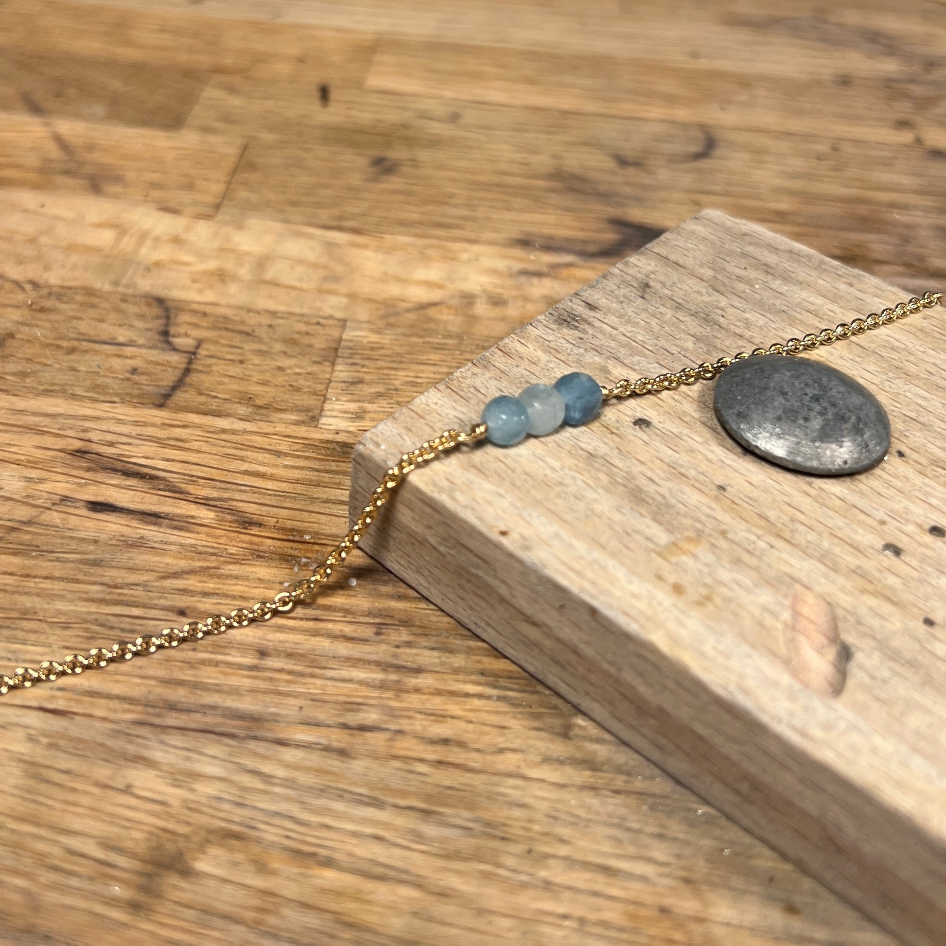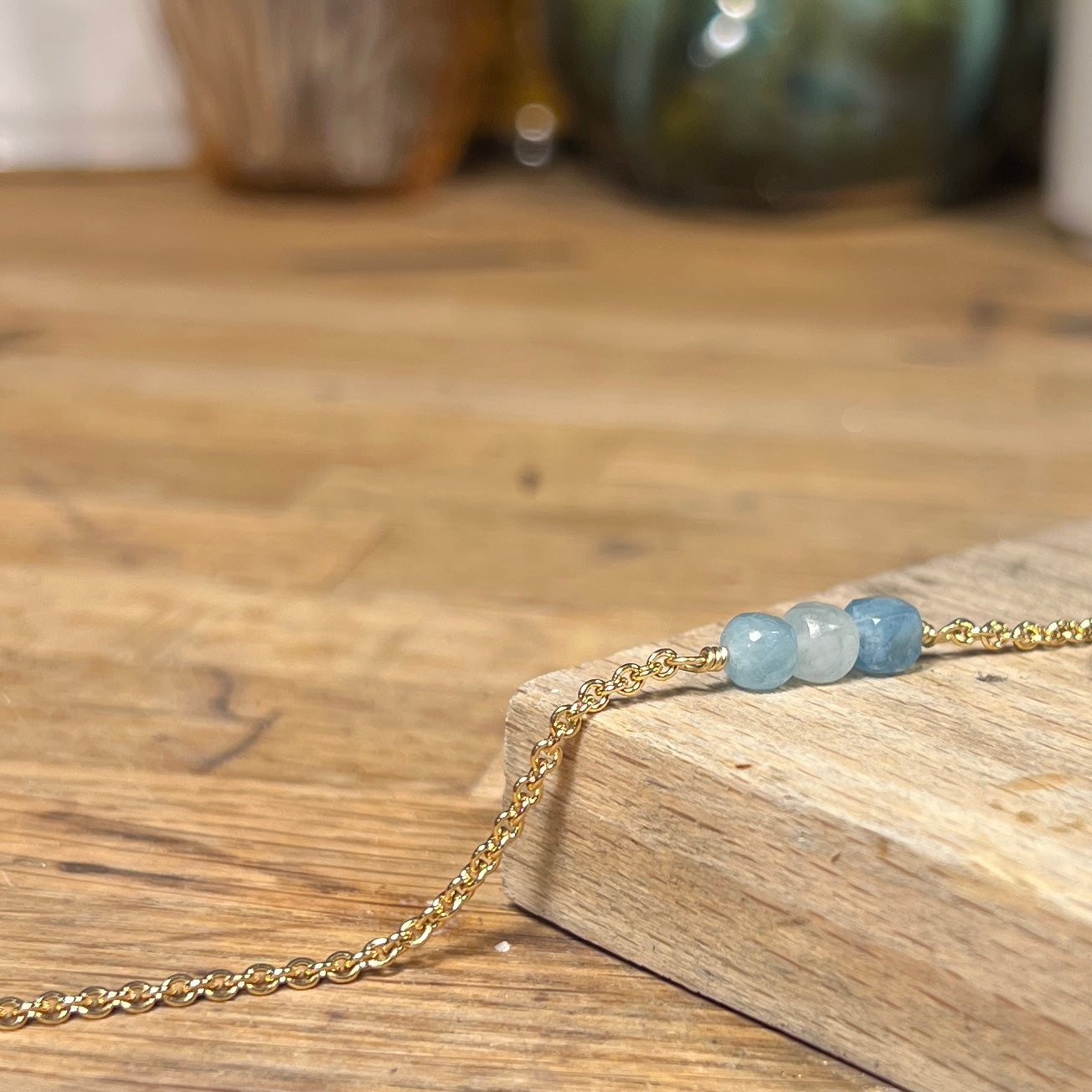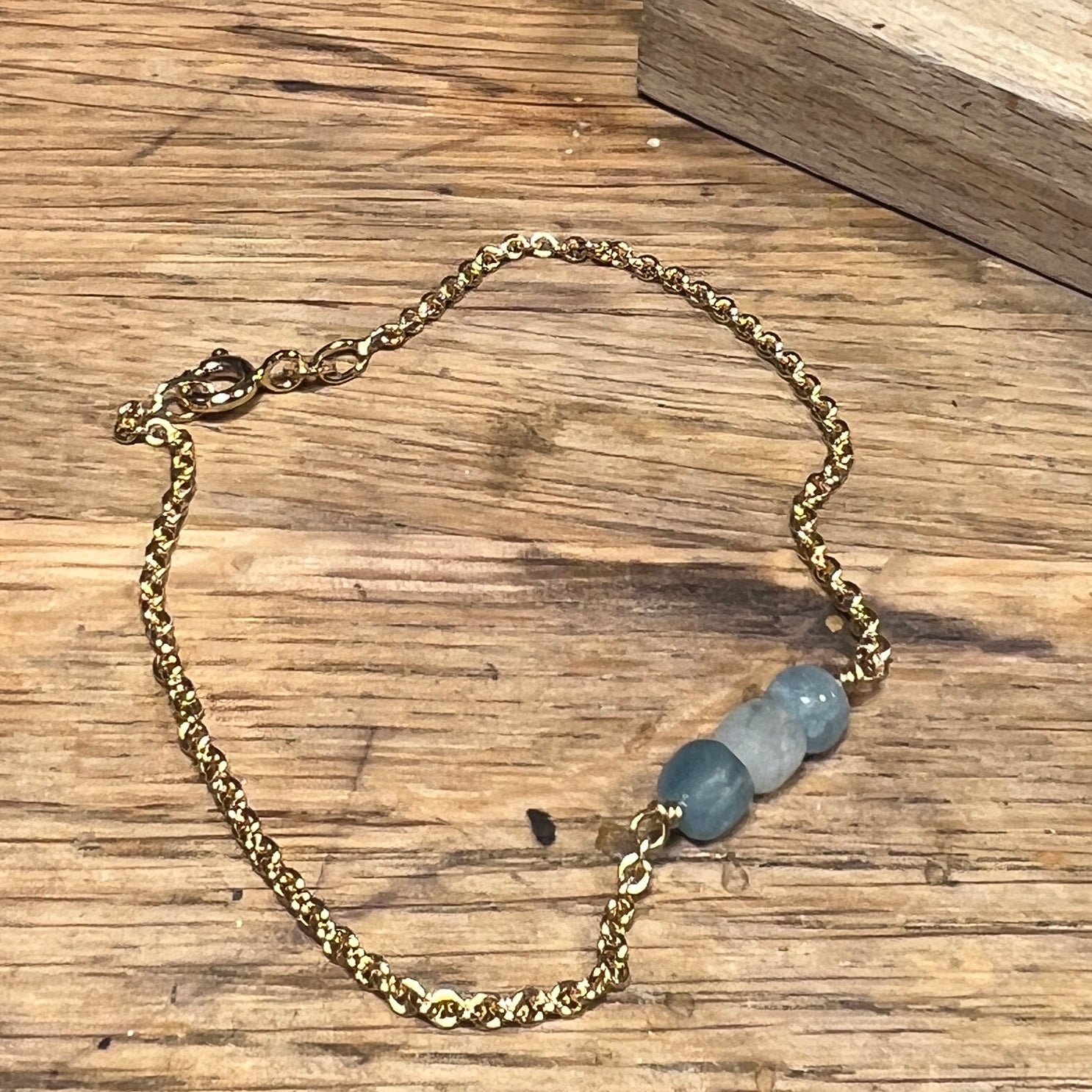 14 karat guldarmbånd med aqvamariner i forskellige nuancer. Armbåndet er 19,5 cm