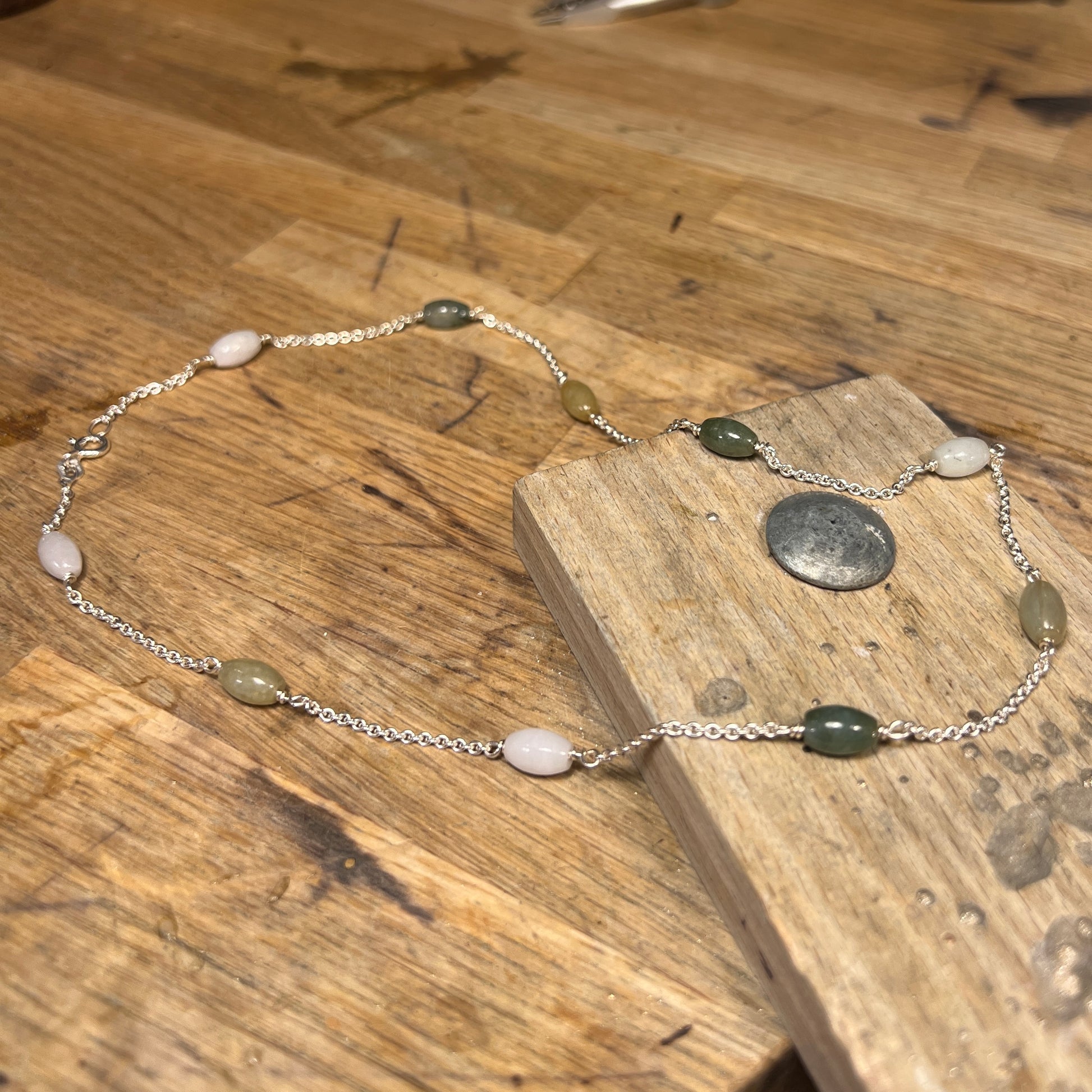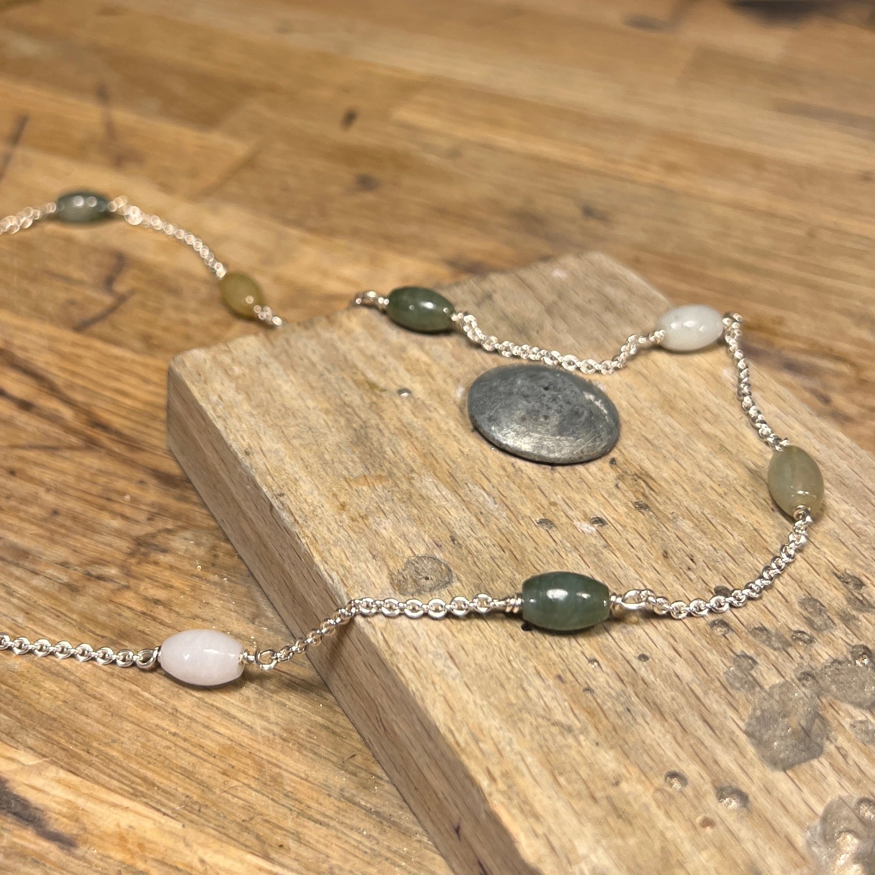 Sølvcollier med ovale glatte jadeperler i forskellige nuancer. Collier er 45 cm langt.