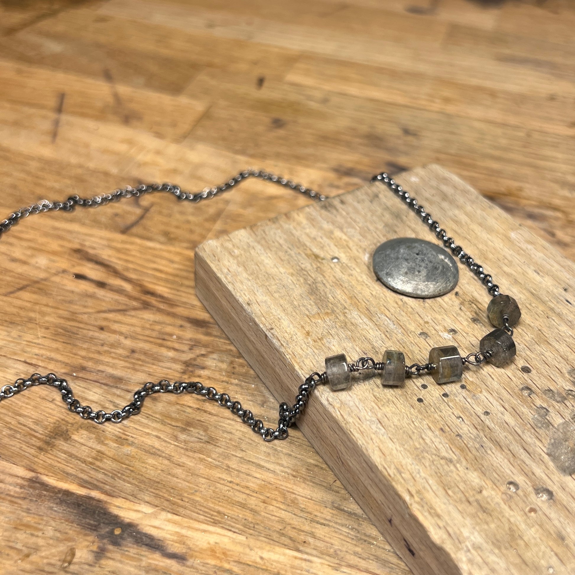 Oxyderet sølvcollier med labordoritter. Kæden er 45 cm lang.