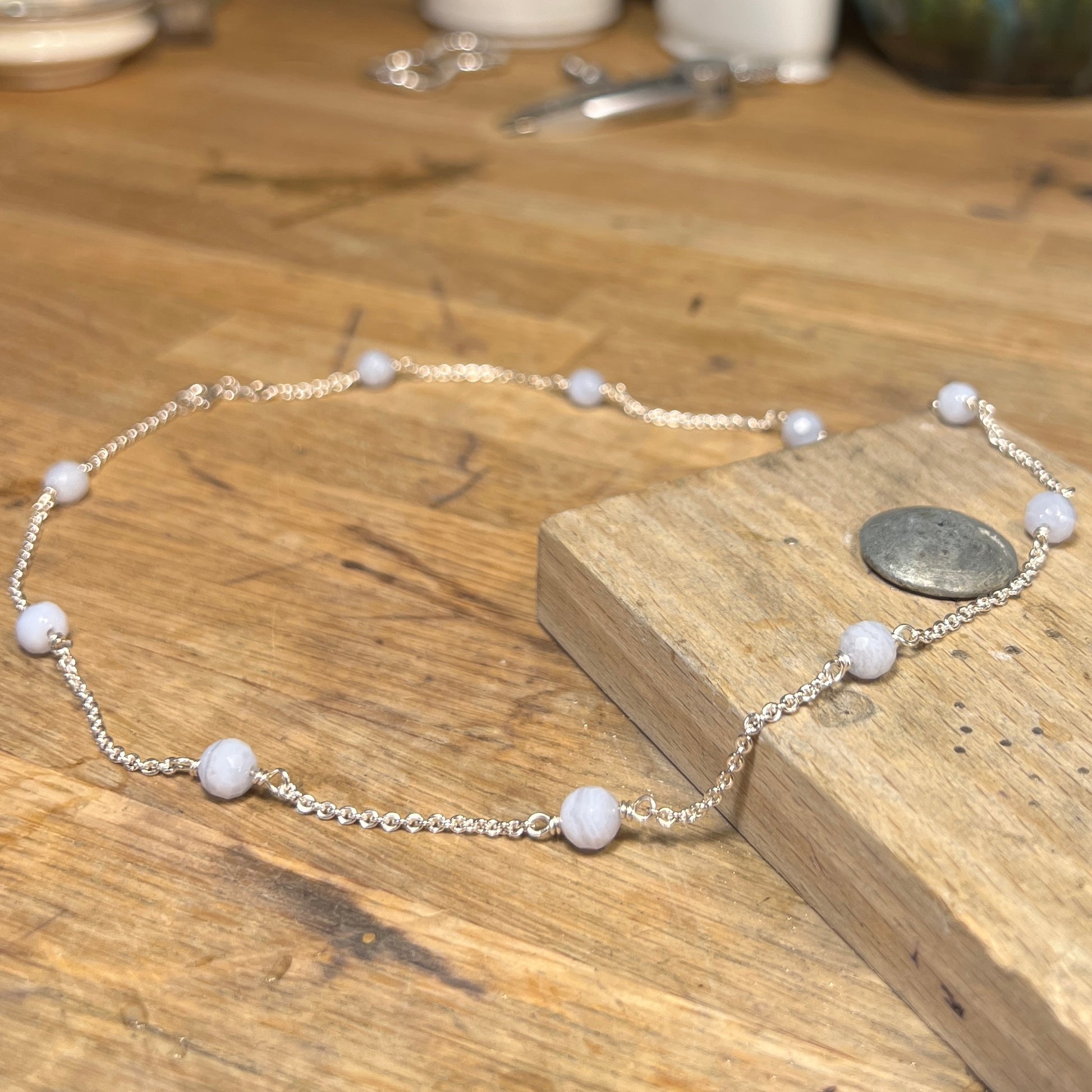 Sølvcollier med runde facetterede calcedoner. Kæden er 42 cm lang