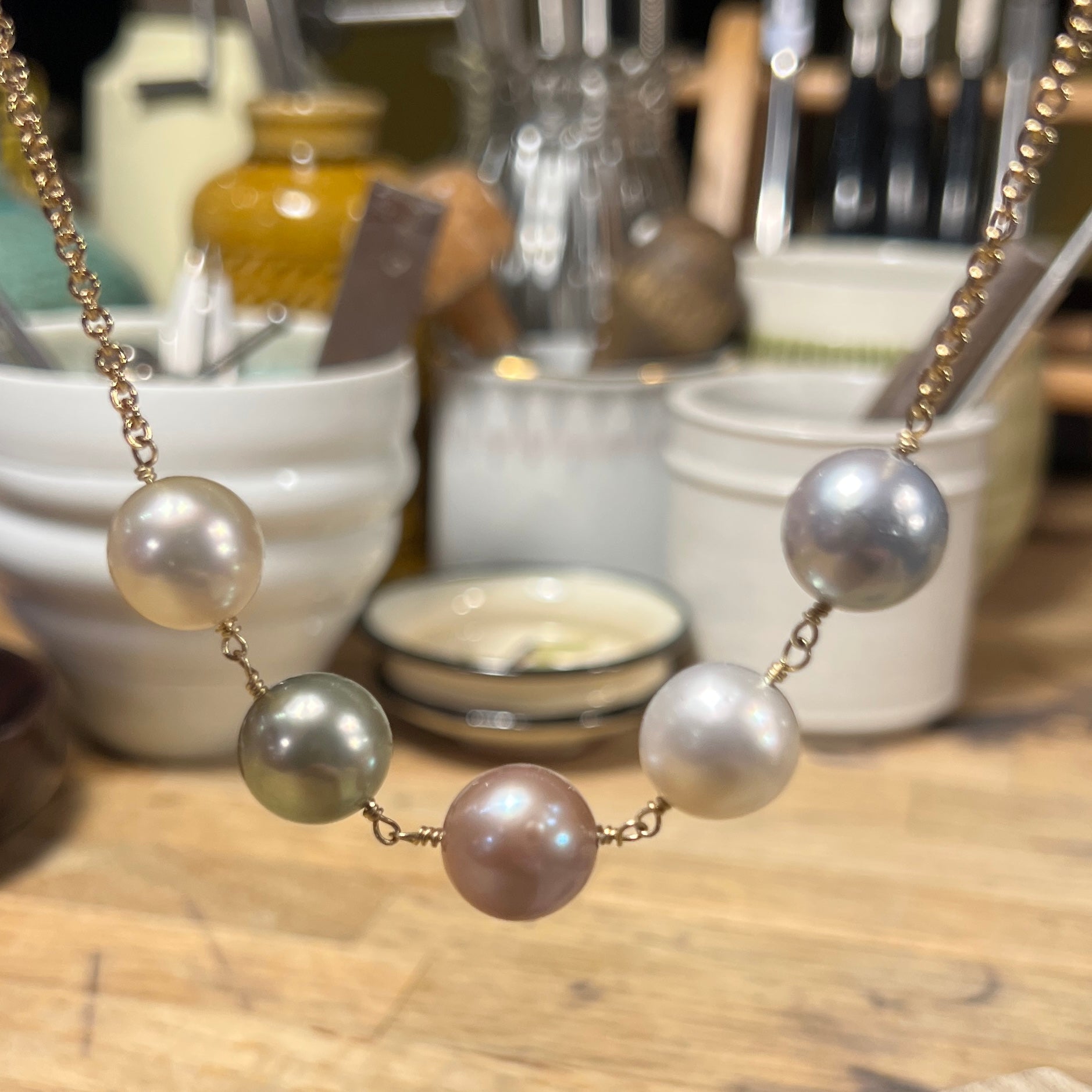 Guldcollier med 3 12 mm South Sea perler, en Tahiti perle 12 mm og en 12 mm ferskvandsperle. Collieret er 44 cm langt.