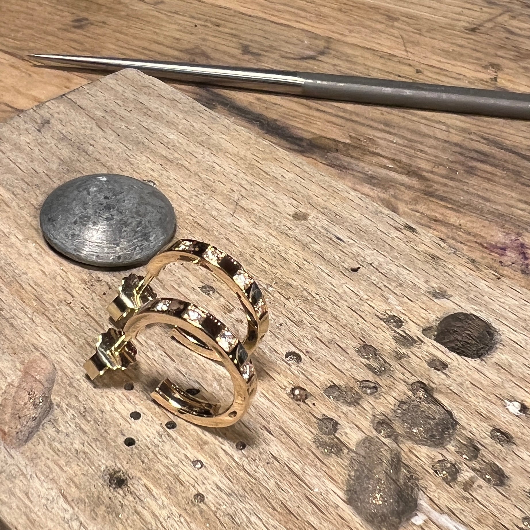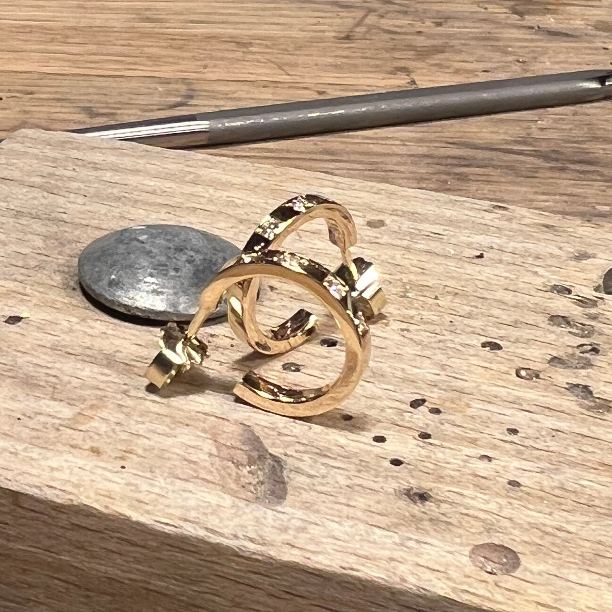 Guldcreoler med brillanter. Creolerne er 16 mm i diameter og har hver 5 sten 0.02 ct.
