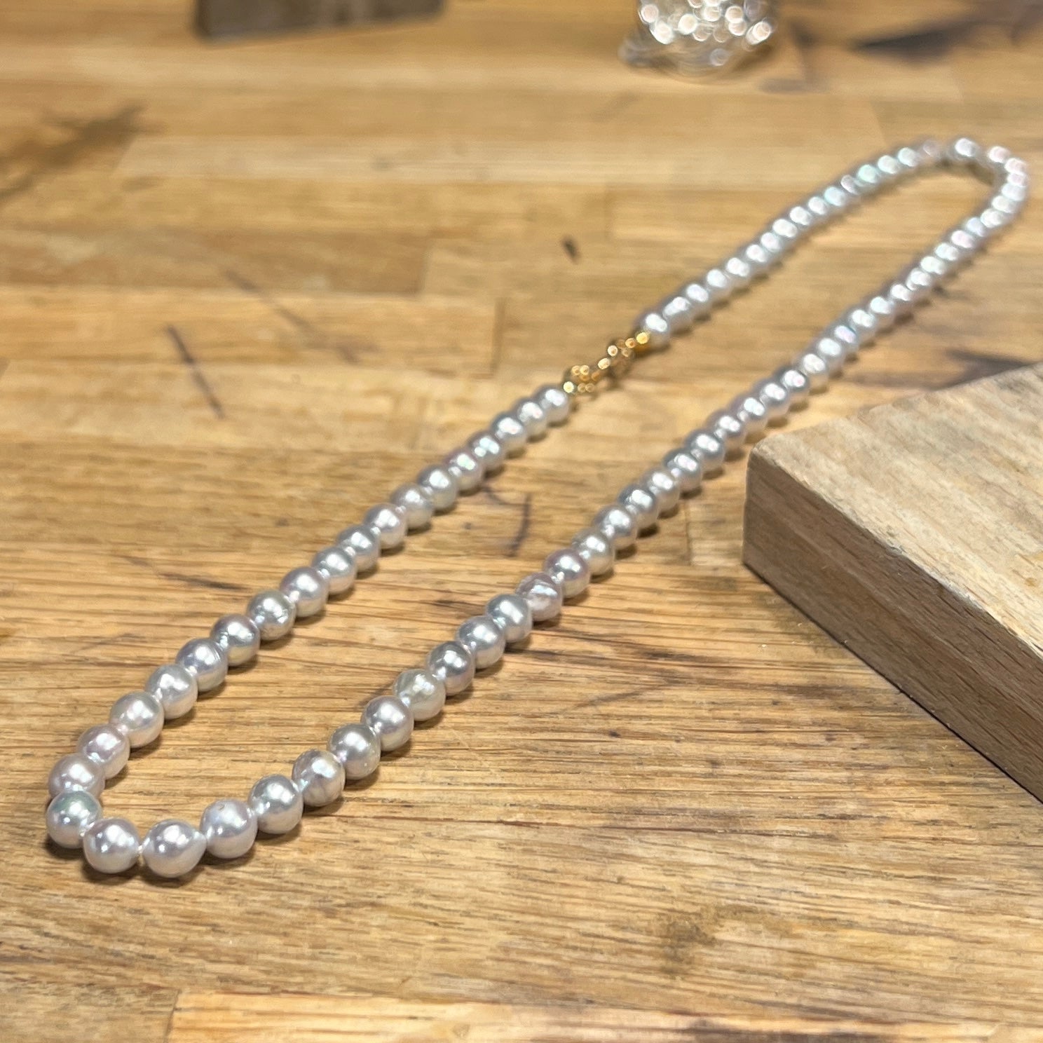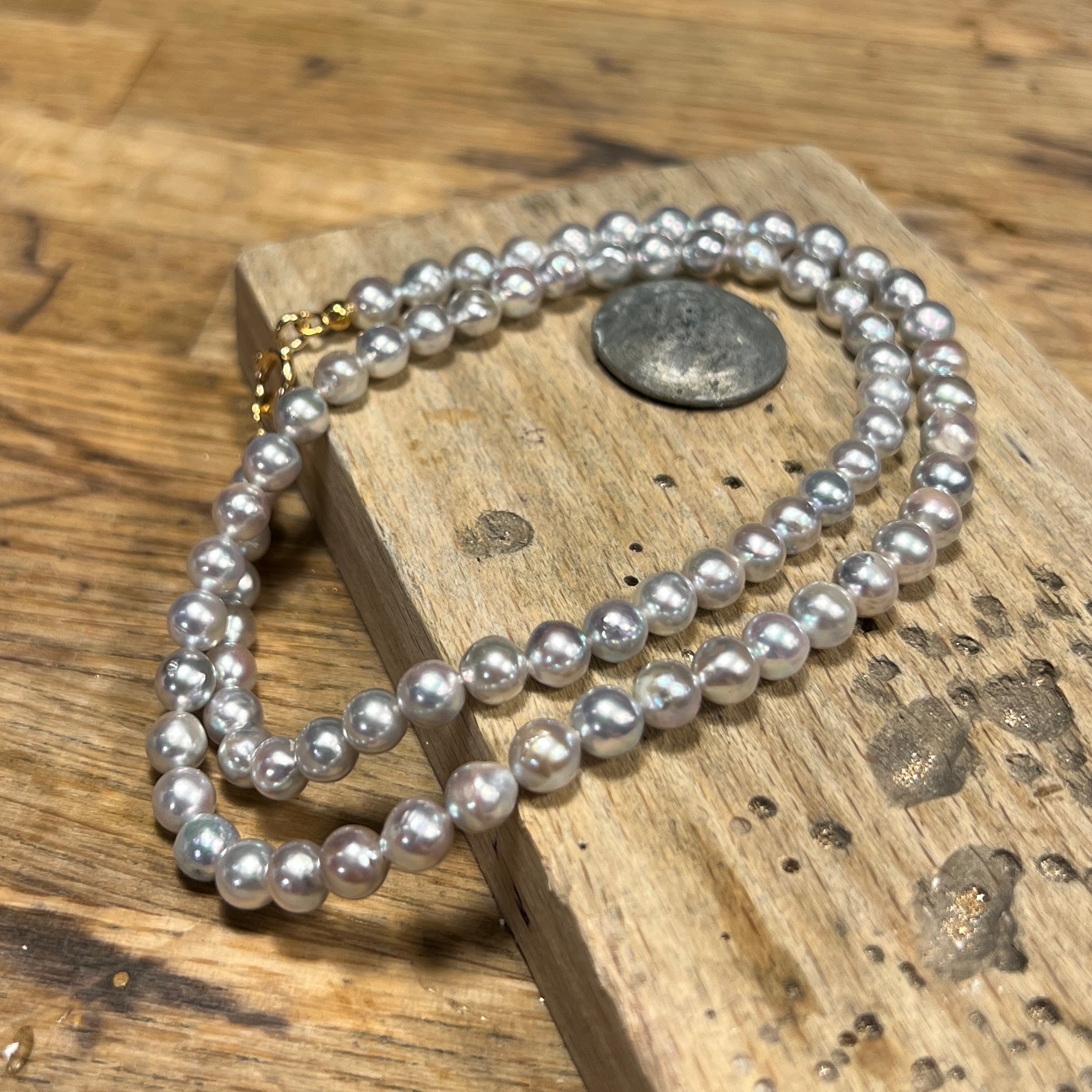 Kultur saltvandsperler i naturlig grå farve. Perlerne er 5-51/2 og kæden er 43 cm lang.
