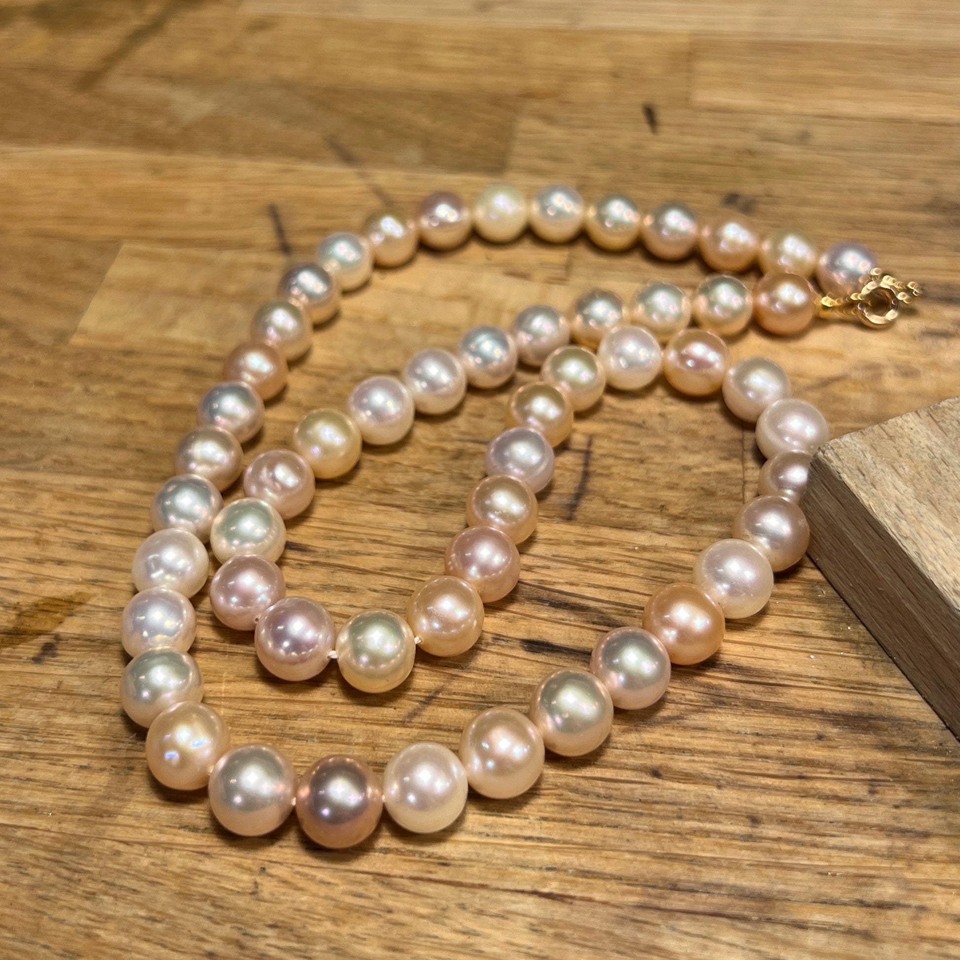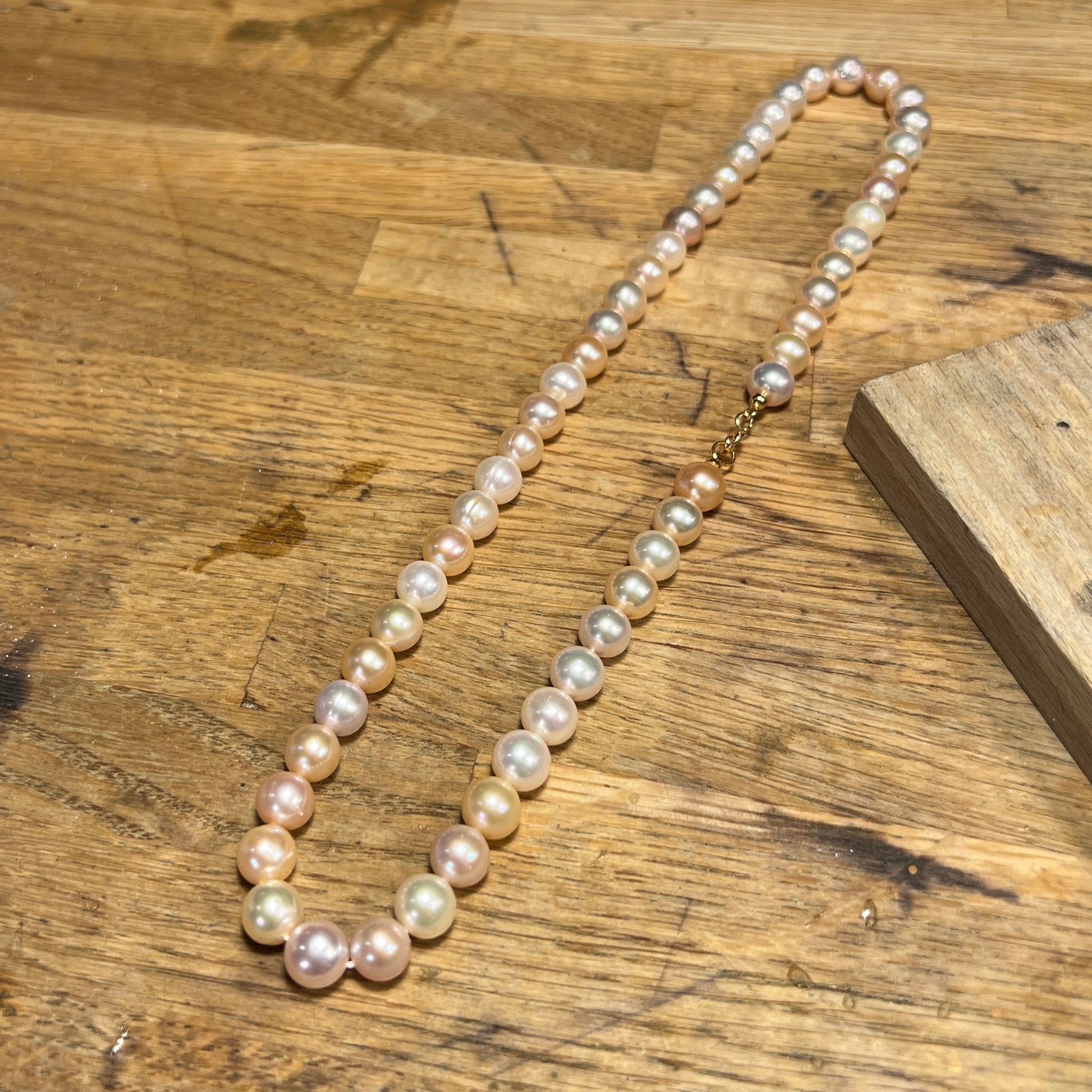 Ferskvandsperler i naturlige hvide, rosa, fersken og gyldne farver. Kæden er 46 cm lang og med guldlås.