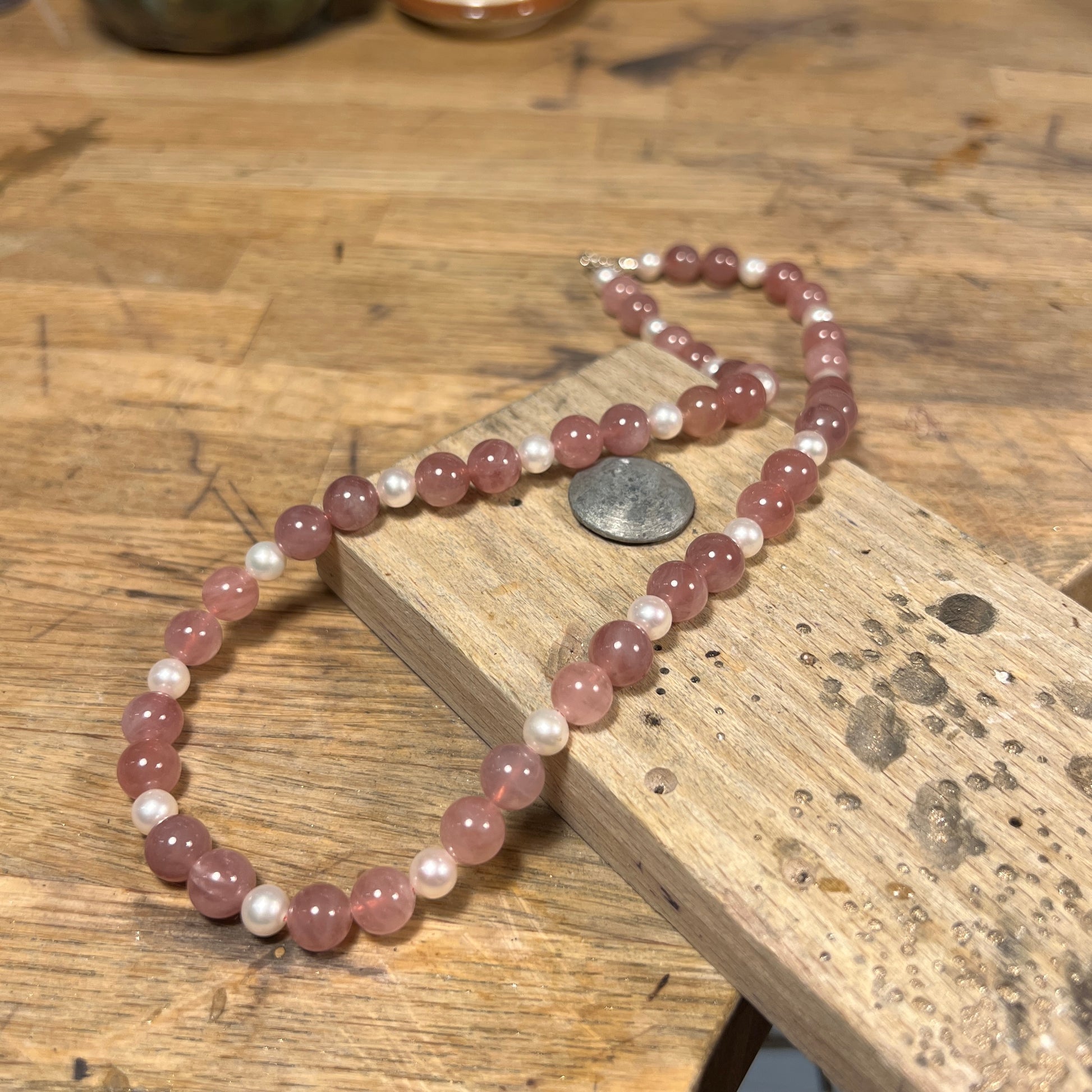 Rosa Quartz fra Madagaskar med ferskvandsperler. Kæden er med sølvlås og 46 cm lang.