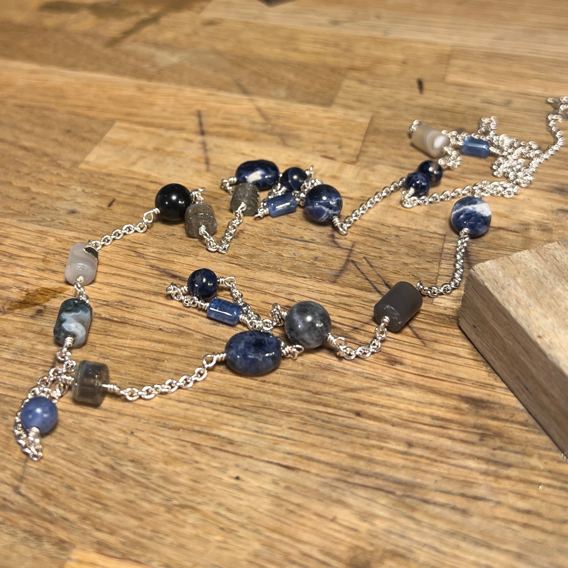 Sølvhalskæde med forskellige sten, sodalit, Botswana agat, turmalin, aqvamarin, blå agat Kæden er 83 cm lang