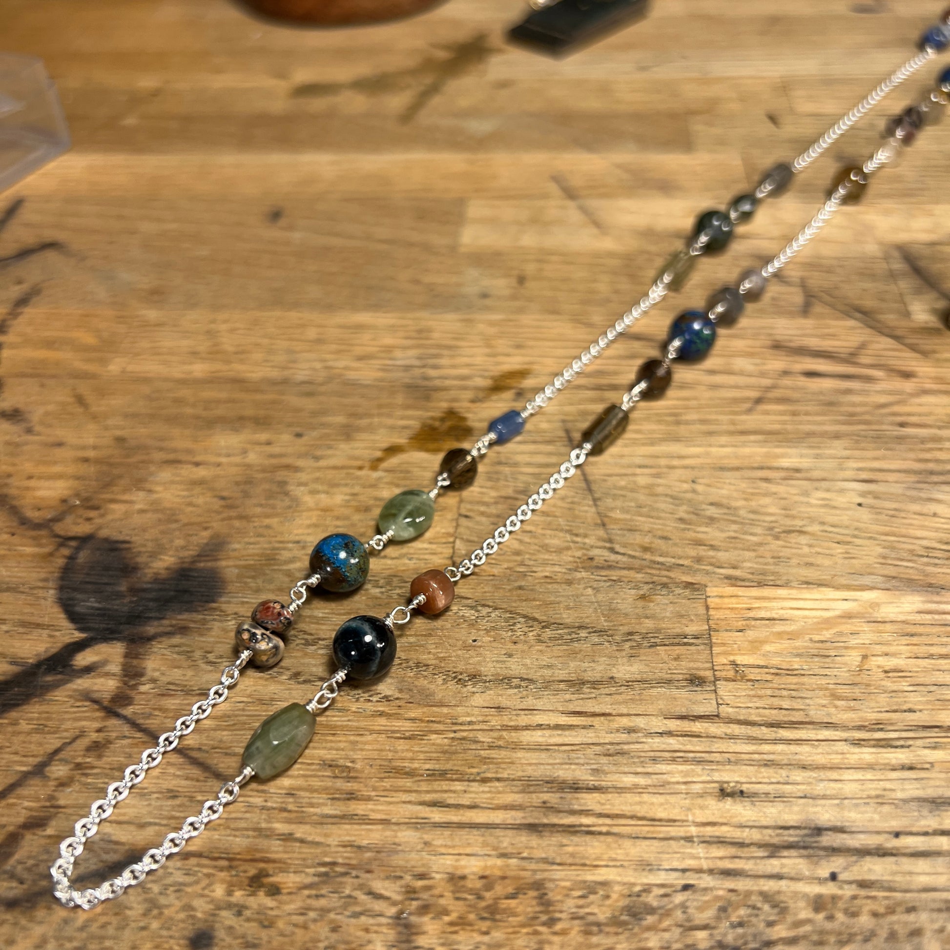 Sølvhalskæde med mix af sten sodalit, blå agat, aqvanmarin, labordorit, turmalin, peridot, cyanit, månesten