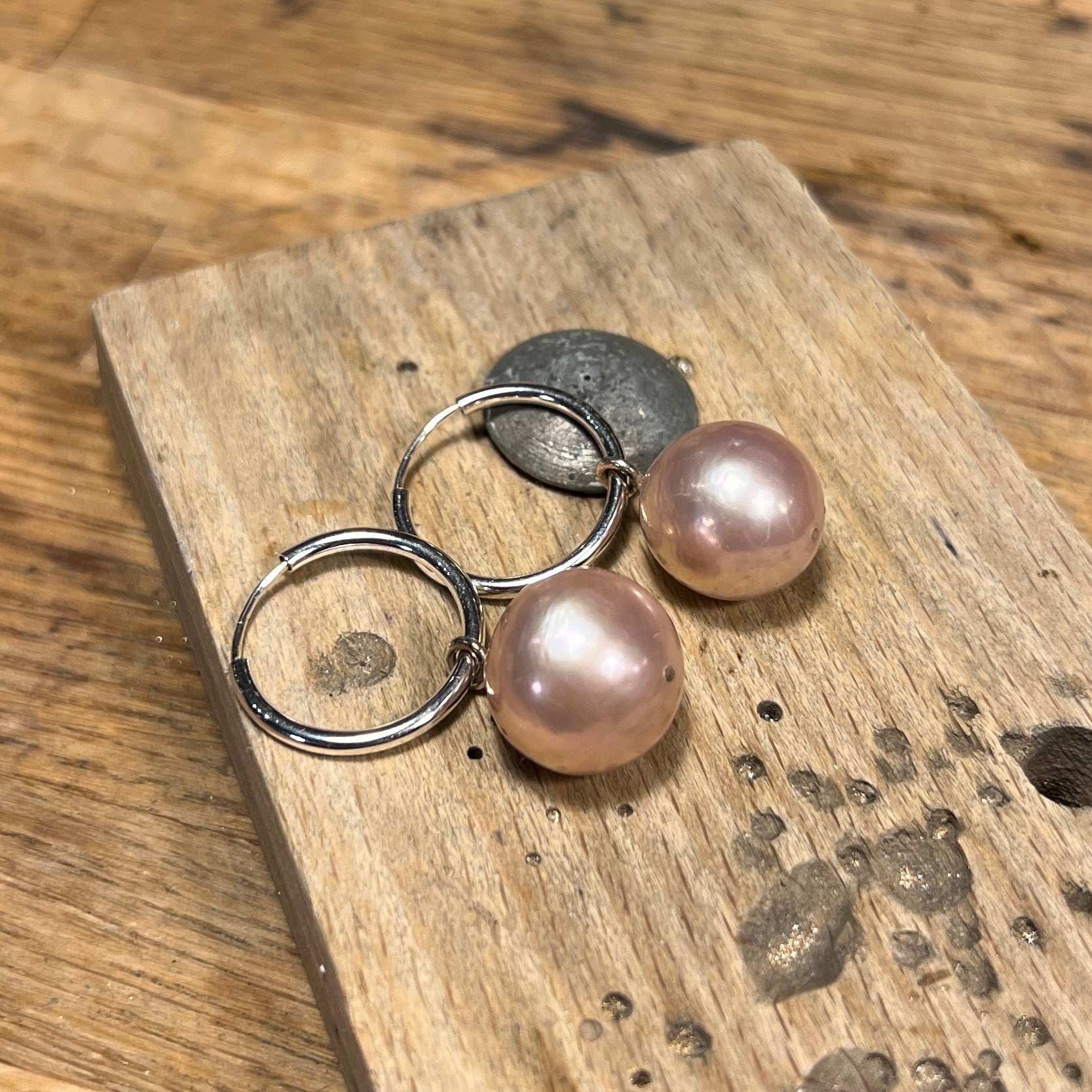 20 mm sølvcreoler med 15 mm ferskvandsperler.