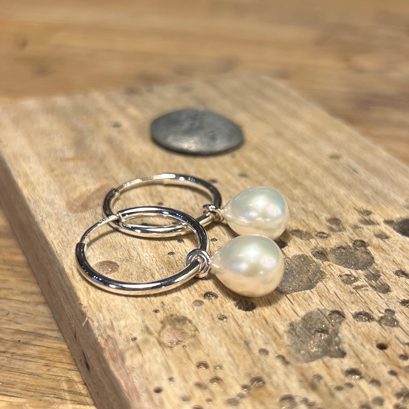 20 mm Sølvcreoler med dråbeformede ferskvandsperler 12 mm.
