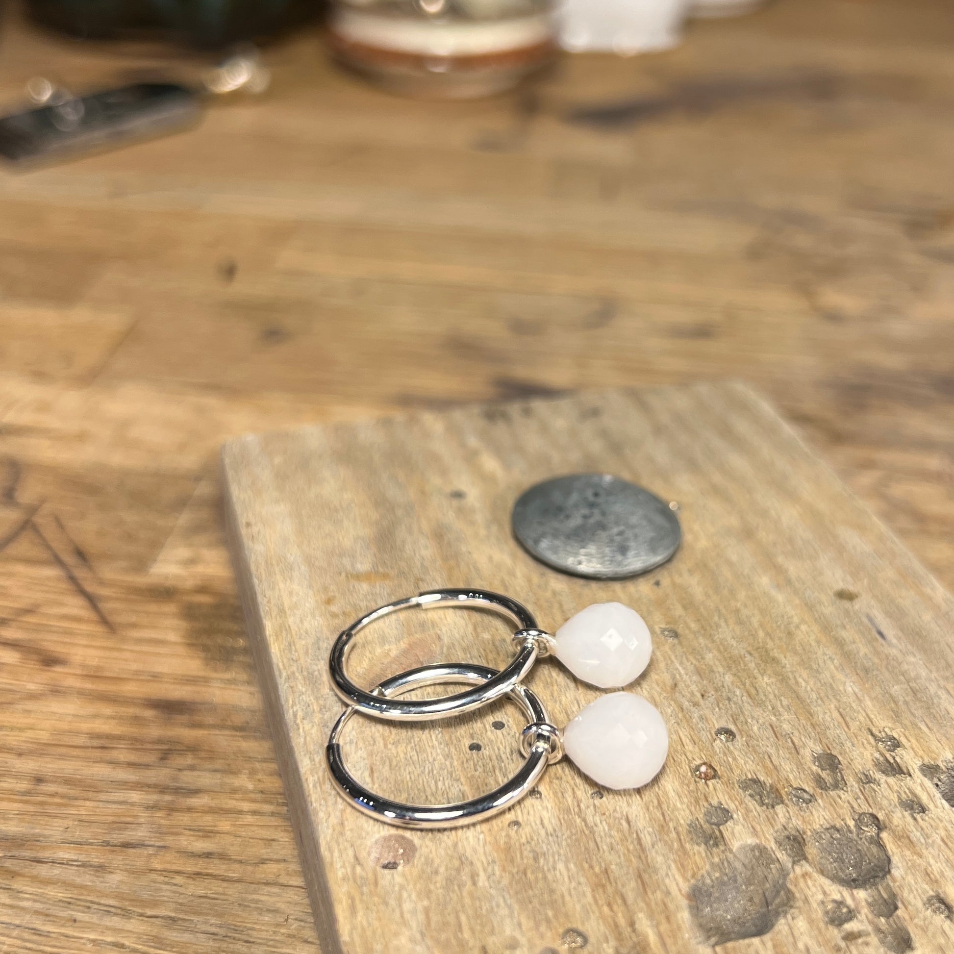 20 mm sølvcreoler med 9 mm facetterede dråbeformede cacholong