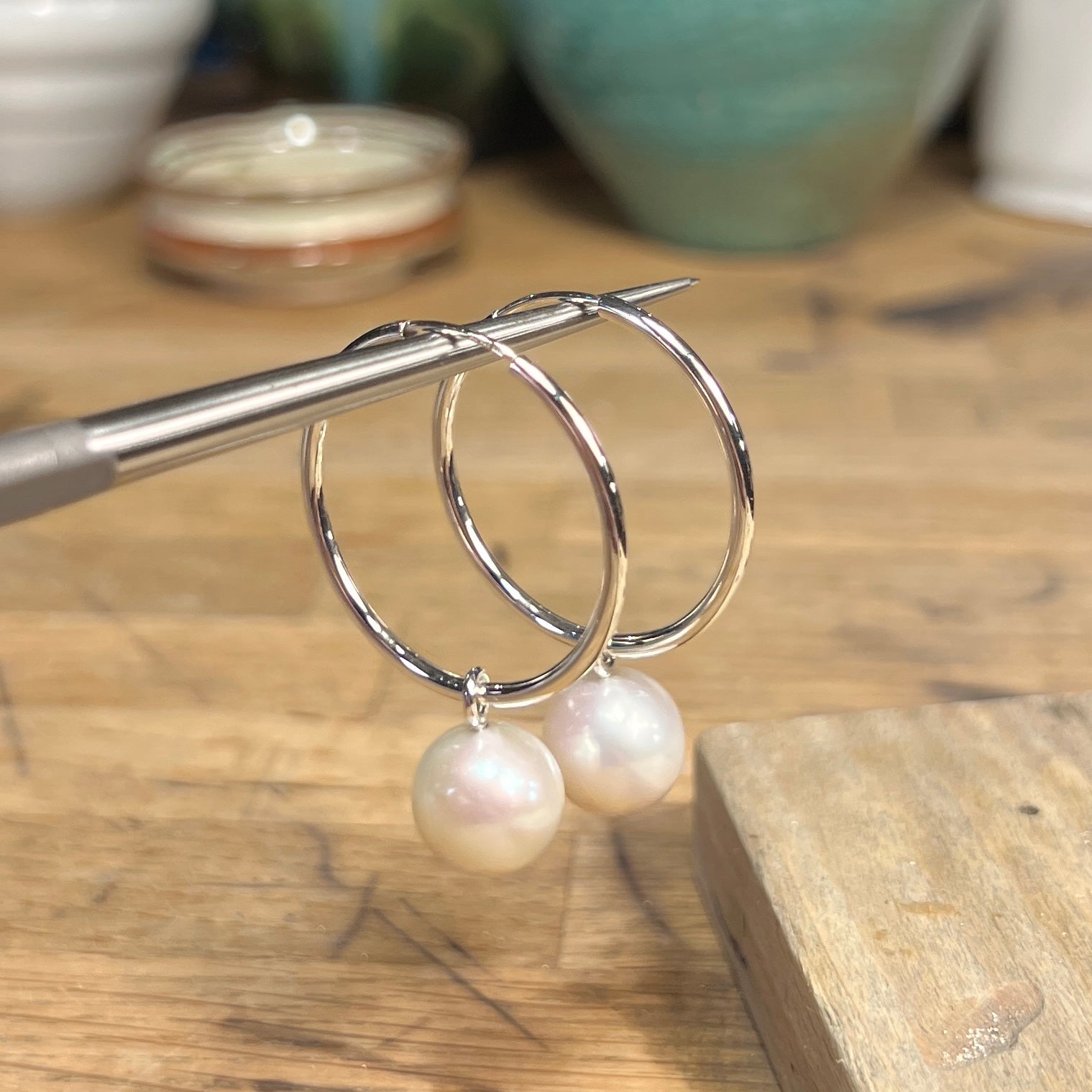 30 mm sølvørecreoler med 11 mm hvide ferskvandsperler