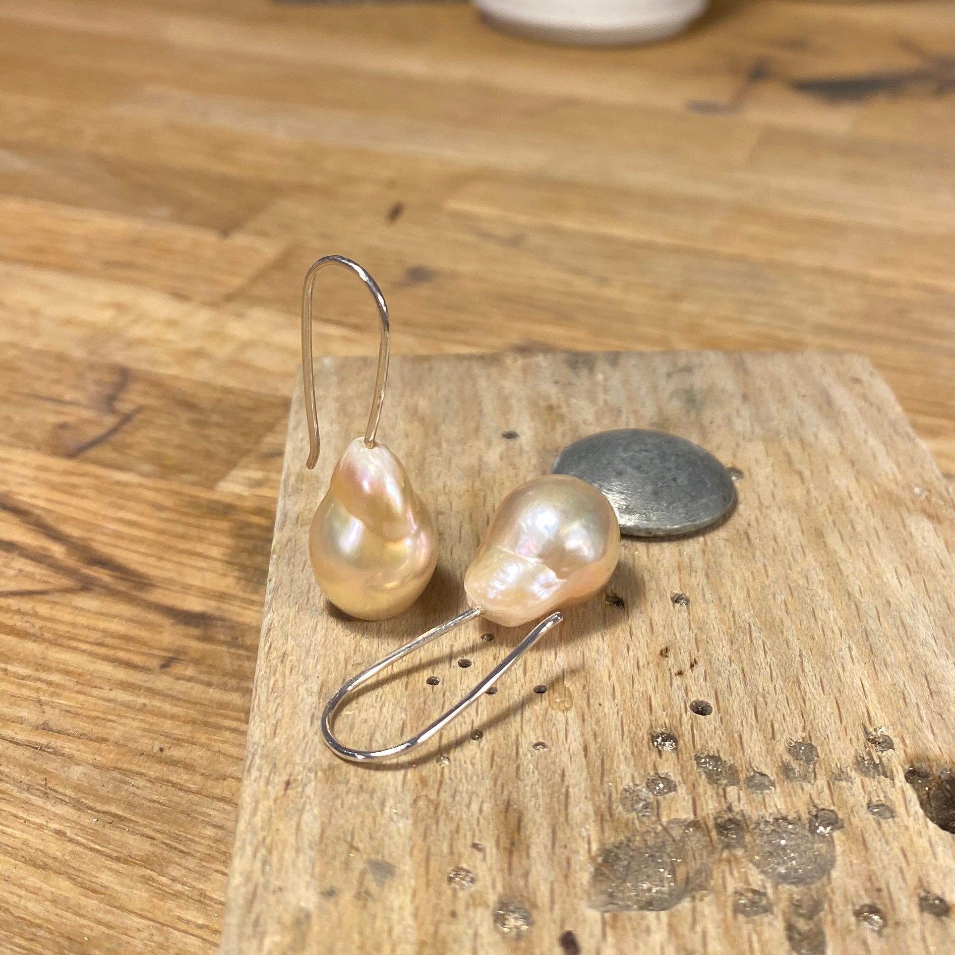 Ørekroge med cremede ferksvandsperle 17 x 11 mm. Total længde 34 mm