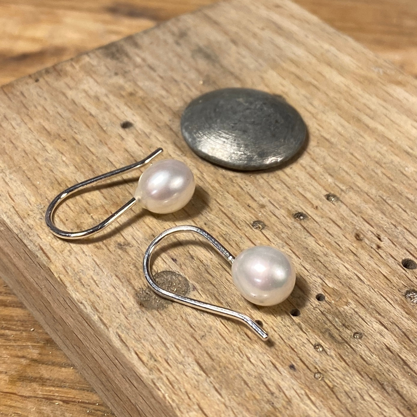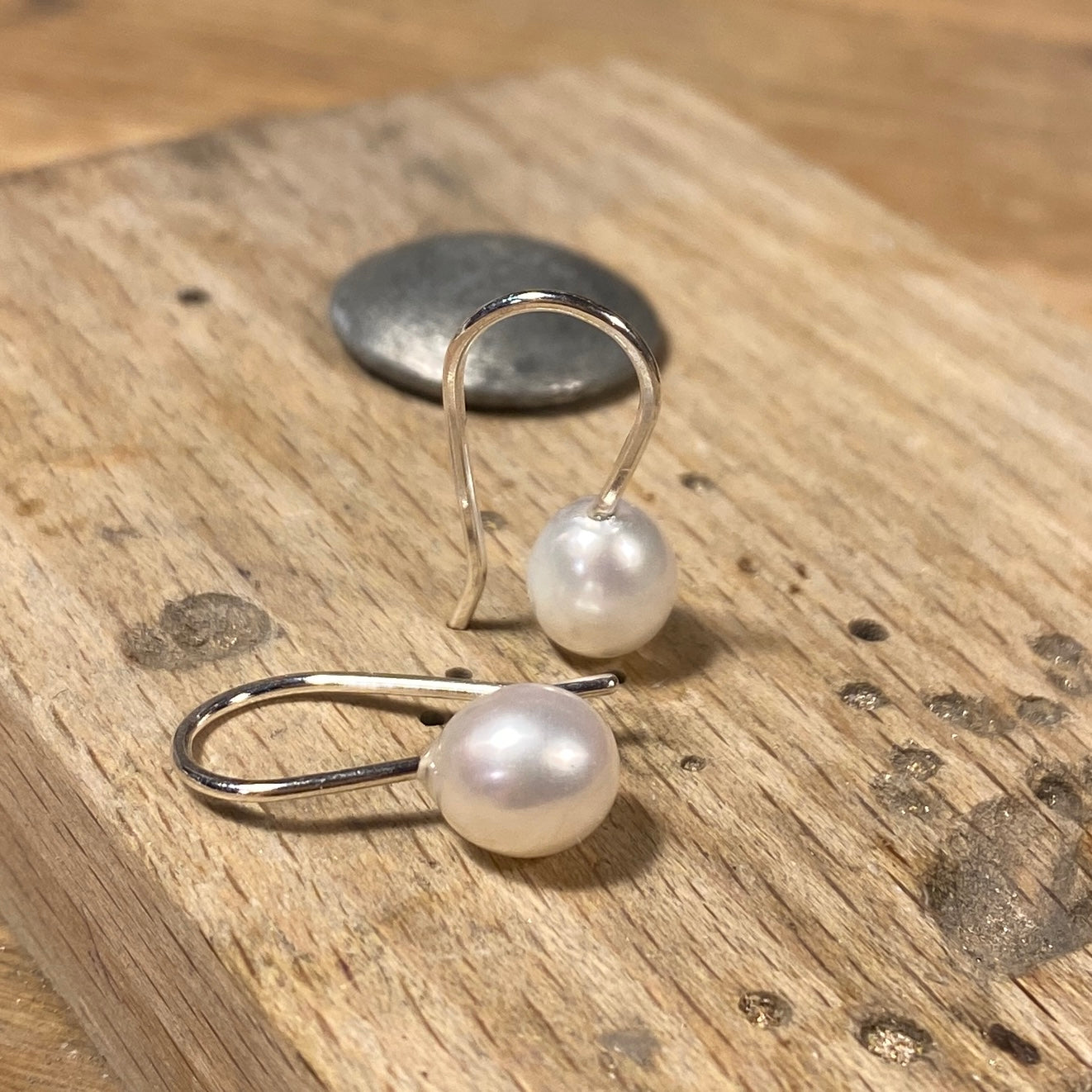 Ørekroge af sølv med dråber af ferskvandsperler. Perlerne er 7 x 8 mm og totallængde 20 mm.