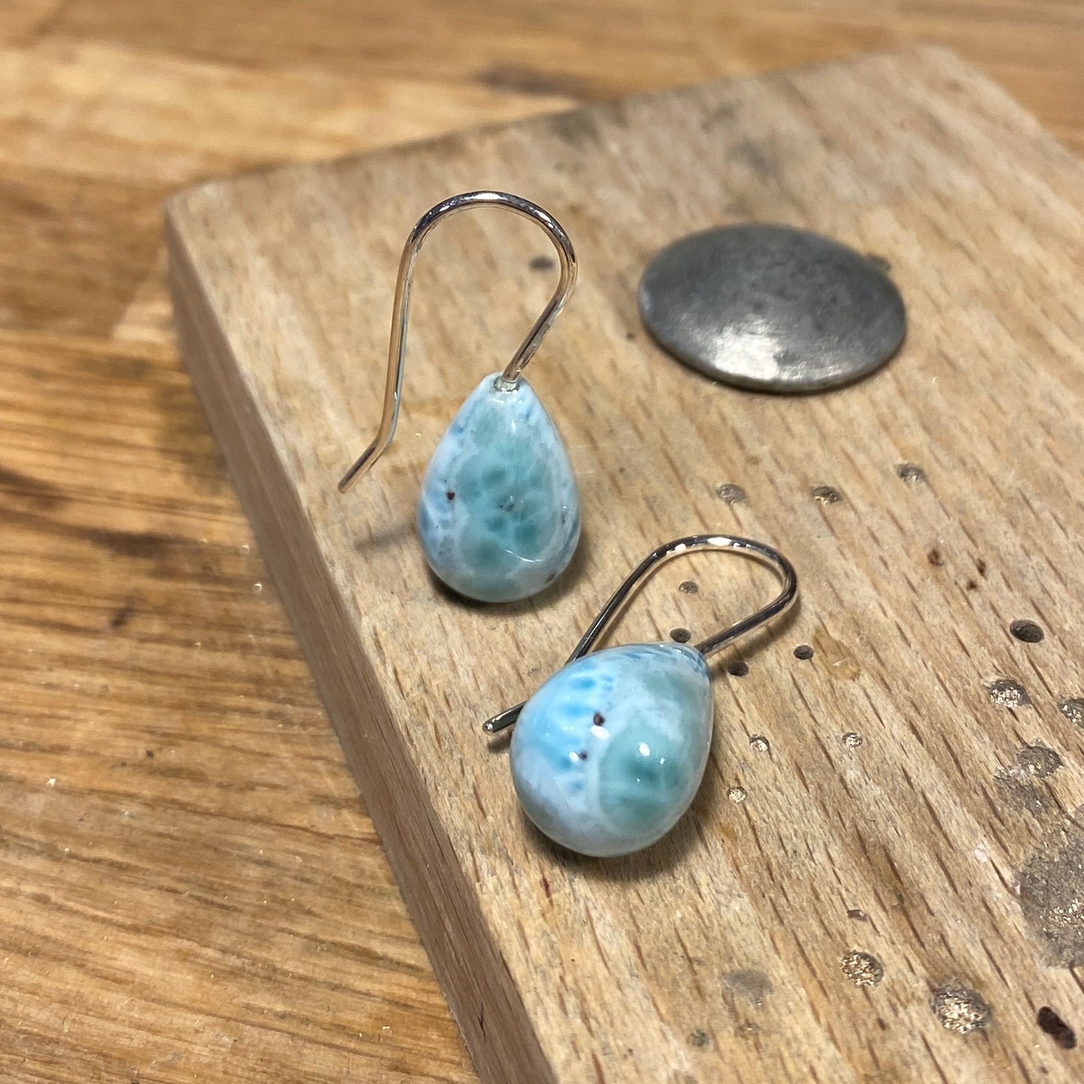 Ørekroge med dråber af larimar 15 x 10 mm . Længden er 28 mm