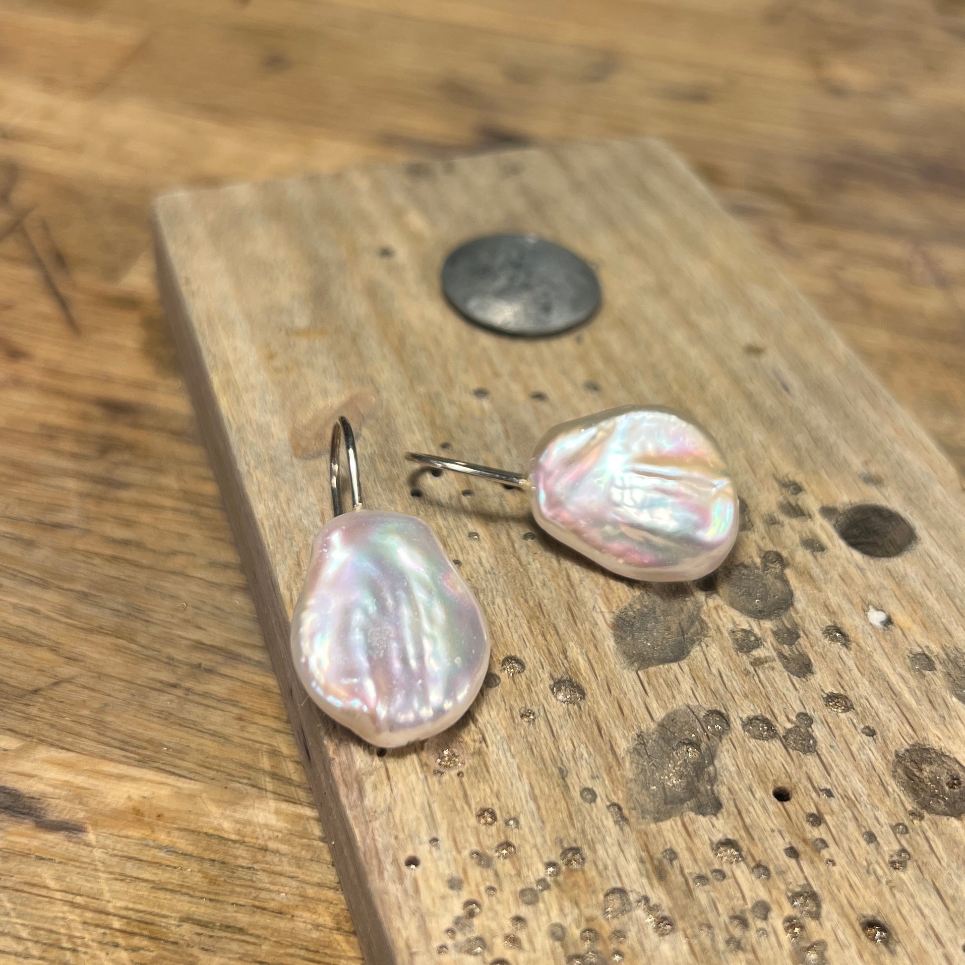 Sølvørekroge med barokke flade ferskvandsperler 16 mm. Ørekrogene er 32 mm