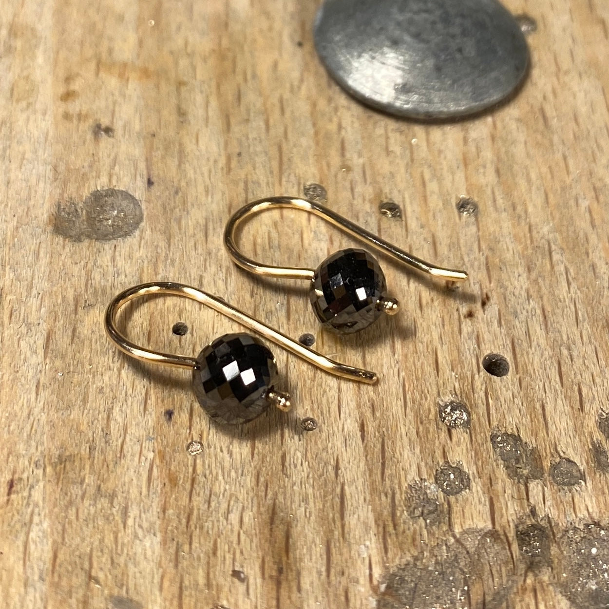 Guldkroge med facetterede sorte diamanter. Diamanten er 6,1 x 5,5 mm og h ele ørekrogen er 20 mm