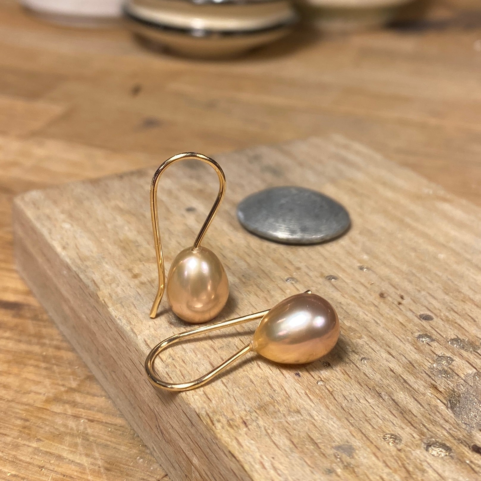 Ørekroge af 14 karat guld og 11 x9 mm dråber i fersken/rosa ferskvandsperler. Ørekrogen er 25 mm