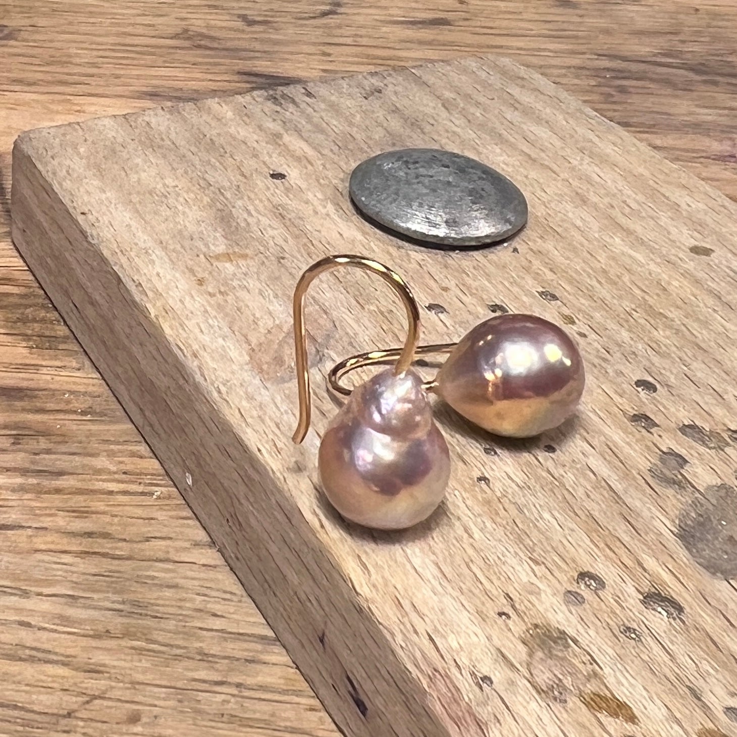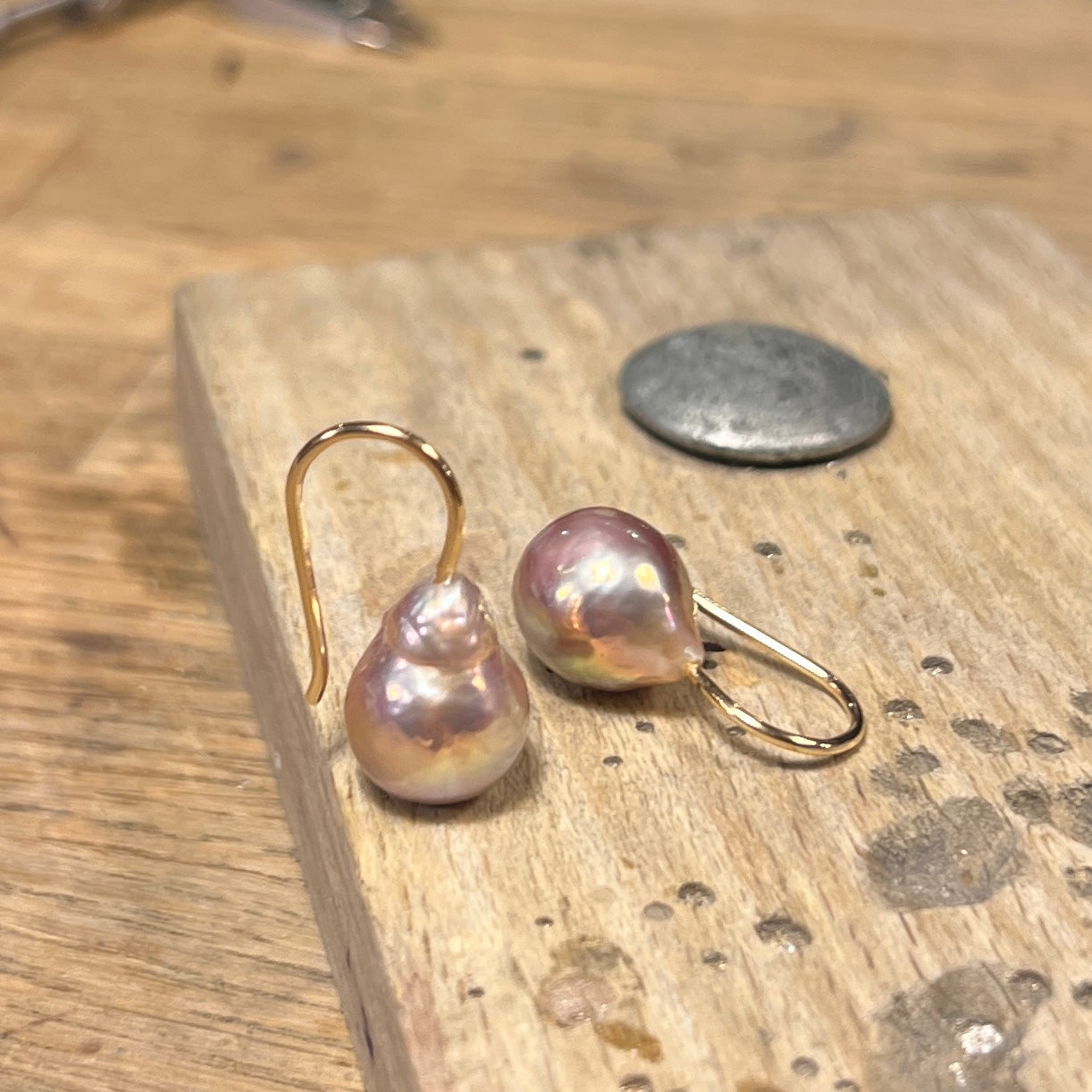 Guldørekroge med mørkrosa dråbeformede uensartede 10 x 12 mm ferskvandsperler
