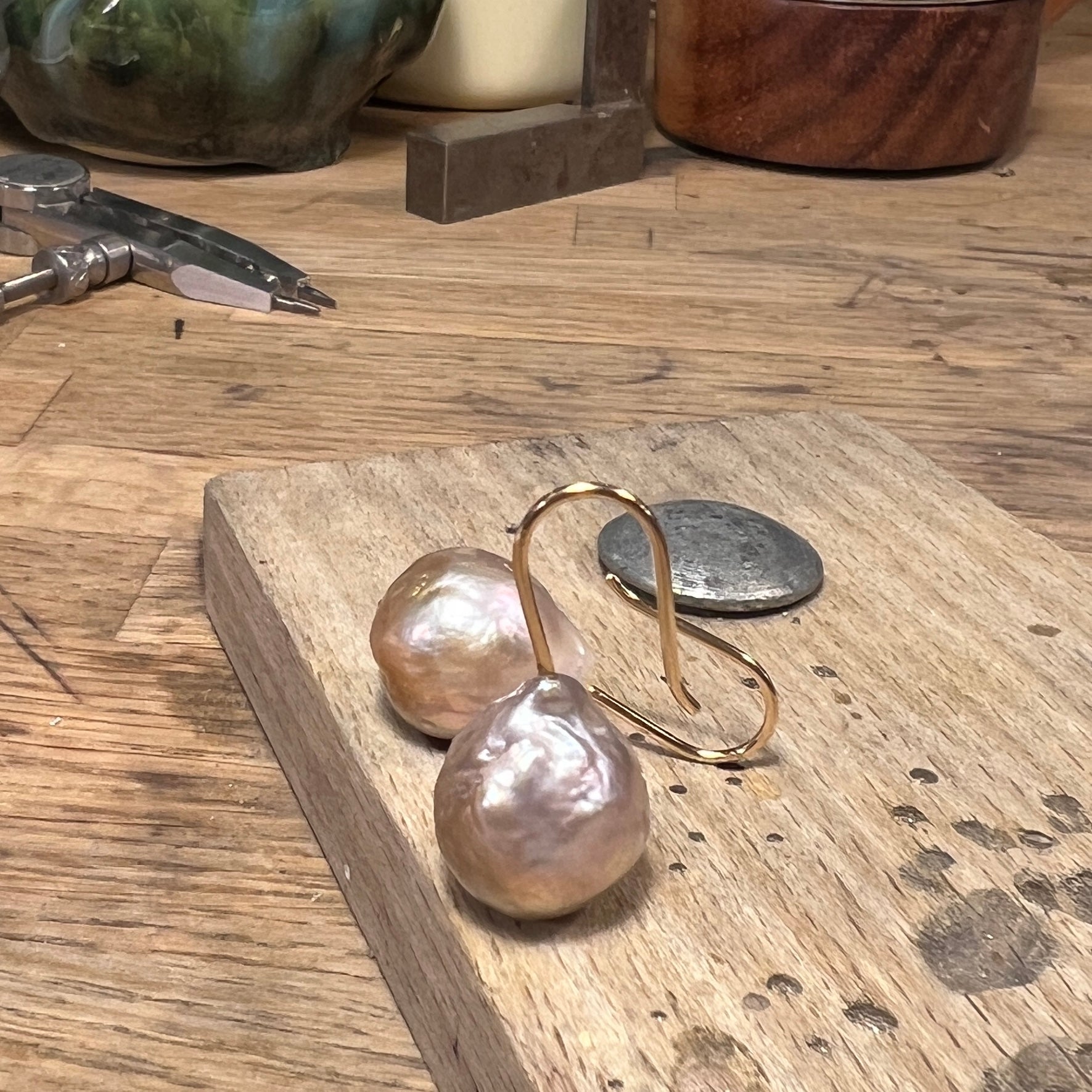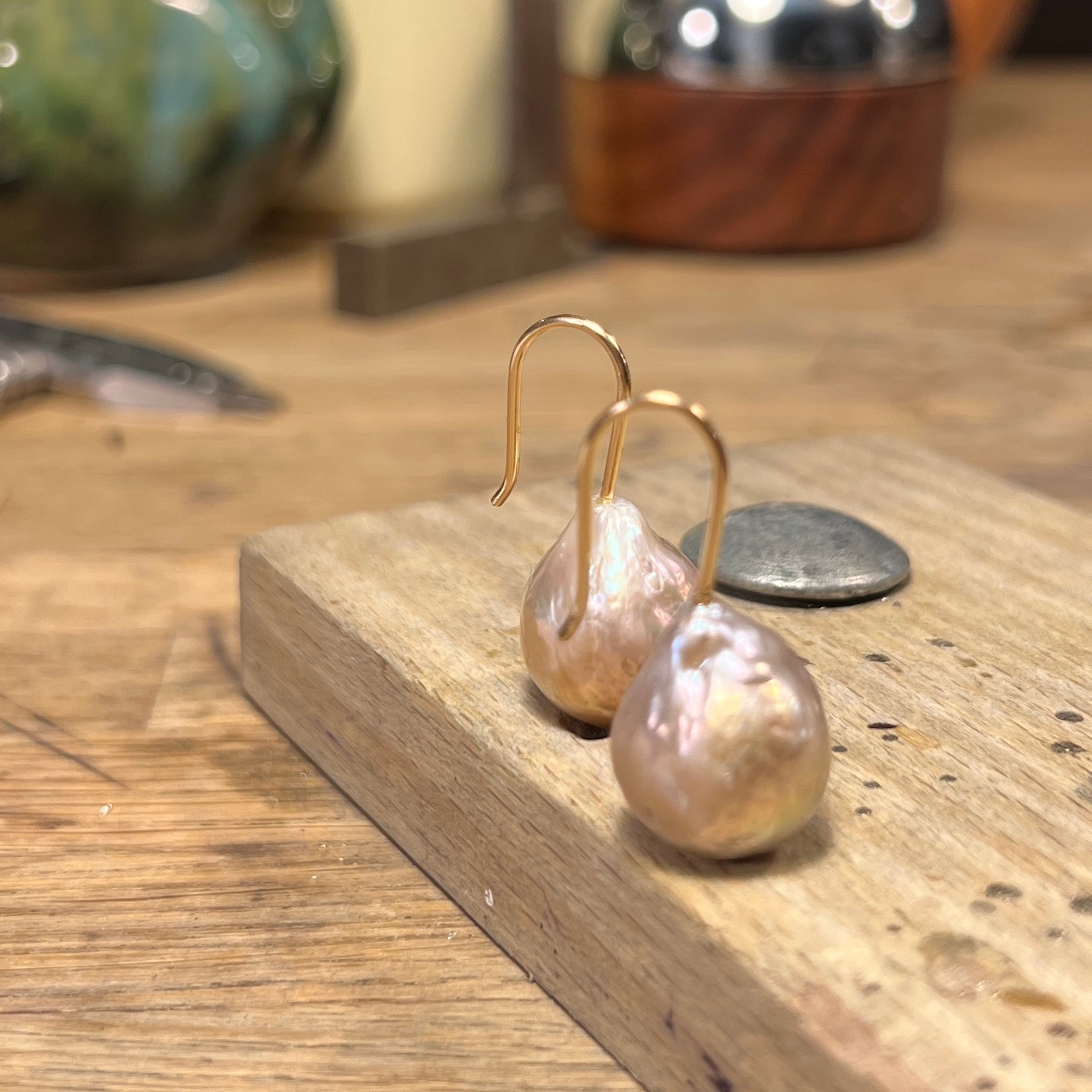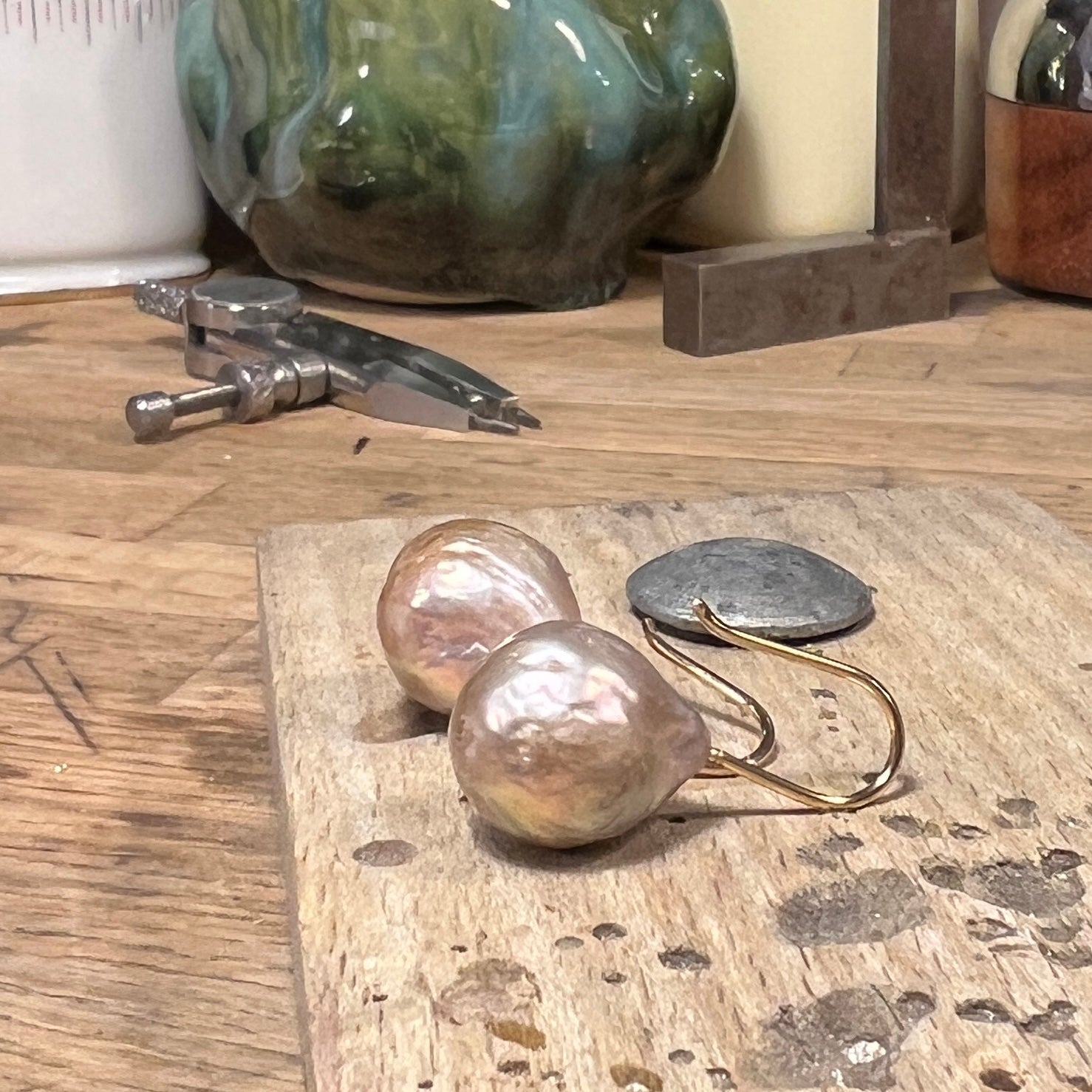 Guldørekroge med gyldne/rosa/beige barokke ferskvandsperler 13 x 16 mm