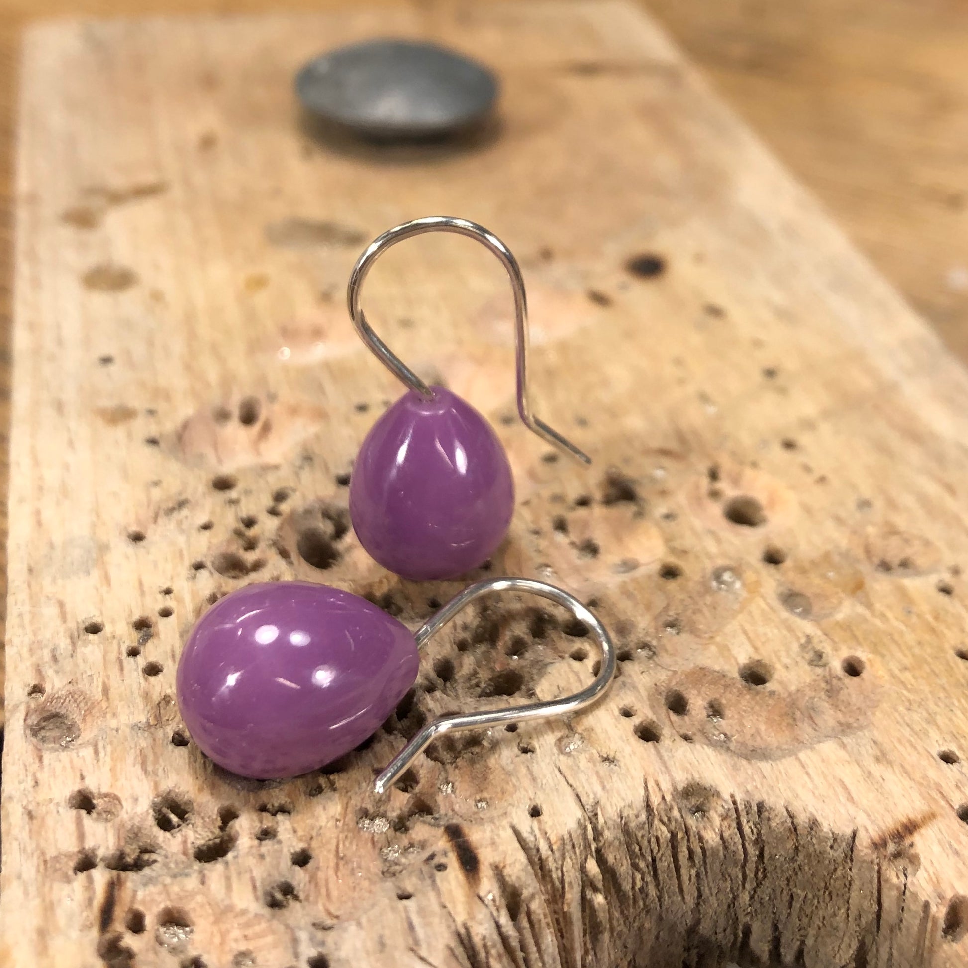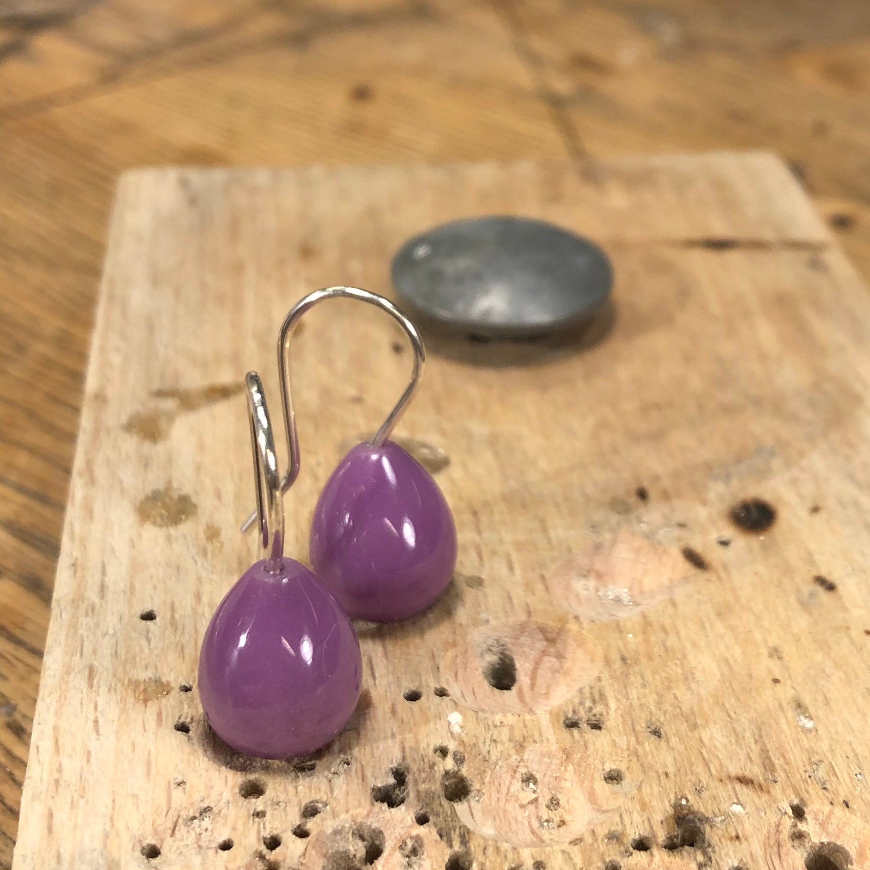 Øreringe af sølvtråd. Krogene afsluttes med 13 x 10 mm glat dråbe heterosite