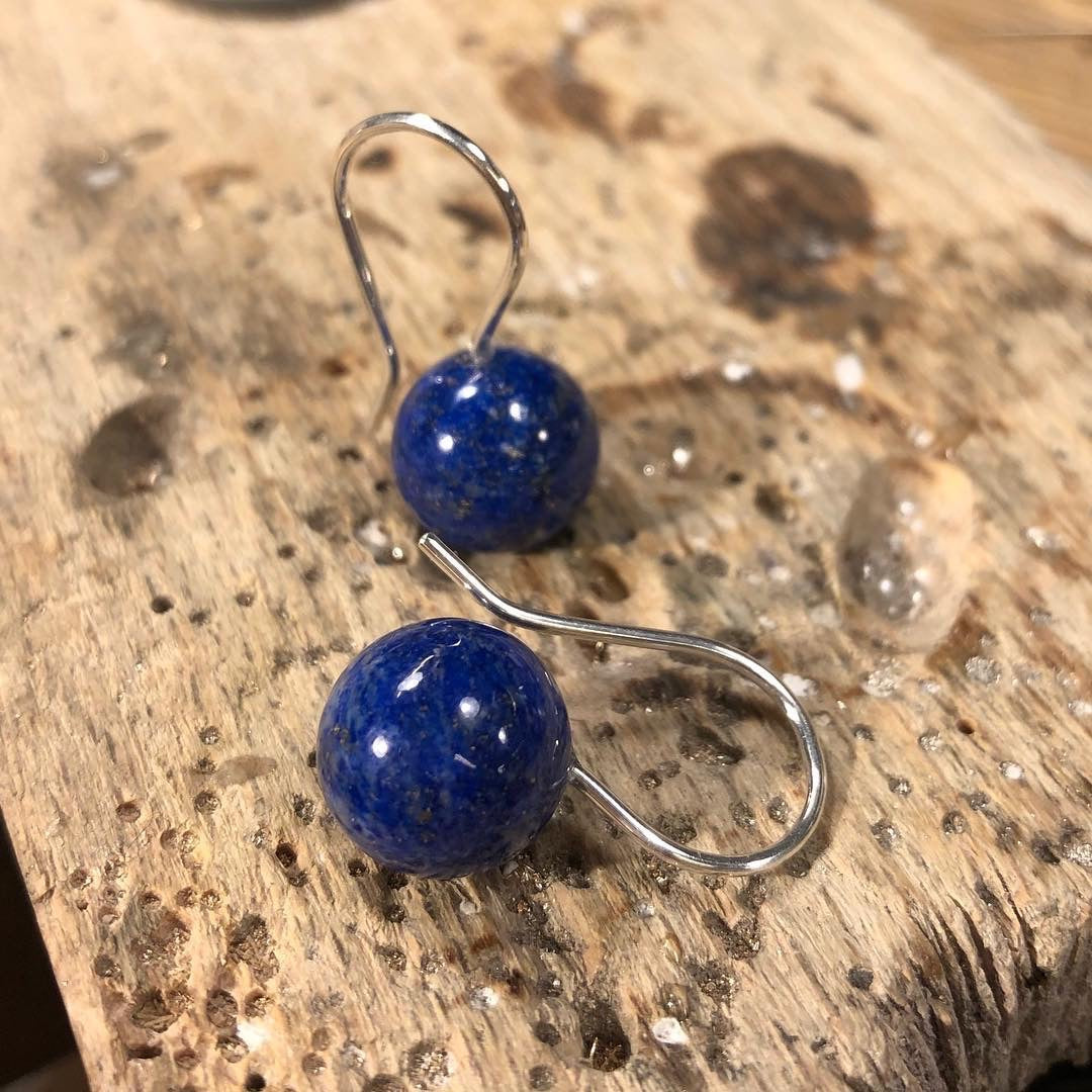 Ørekroge af sølvtråd. Øreringene er afsluttet med 10 mm runde glatte blå lapis lazuli.