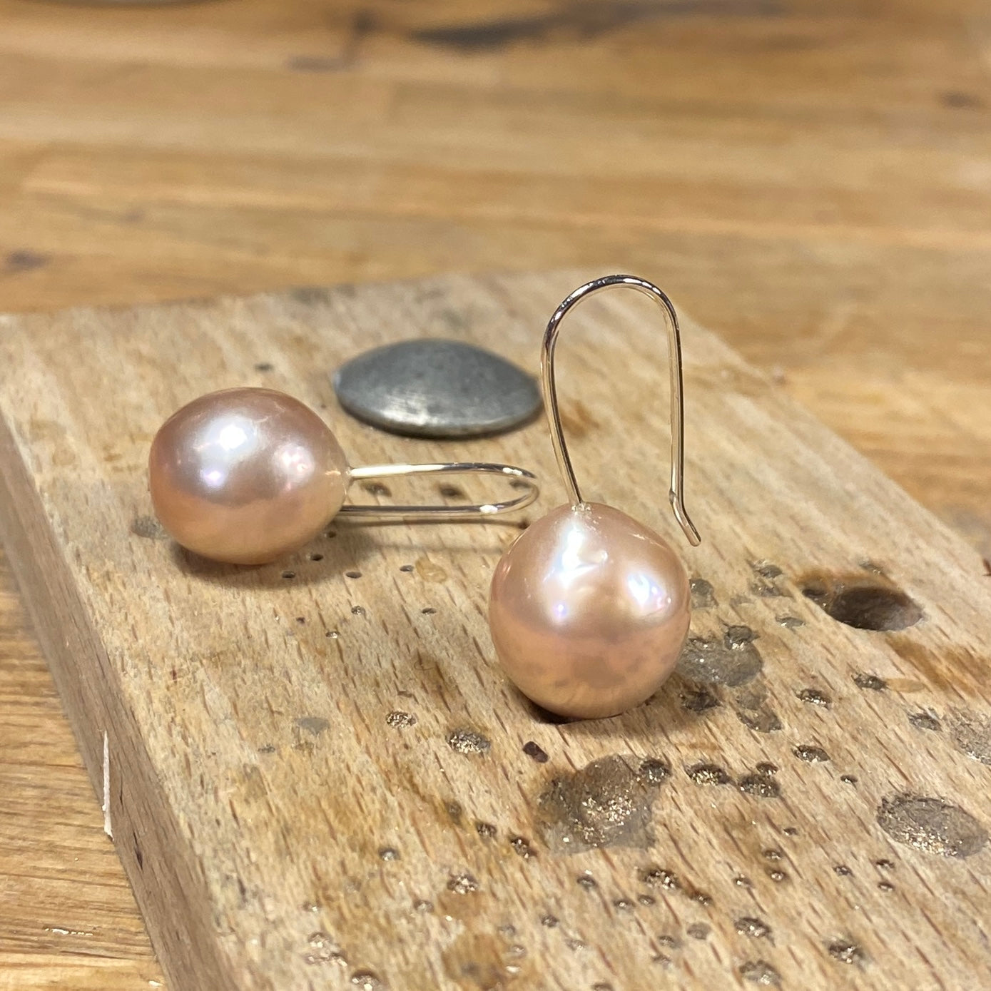 Ørekroge med lys rosa ferksvandsperle 15 x 14 mm. Total længde 30 mm