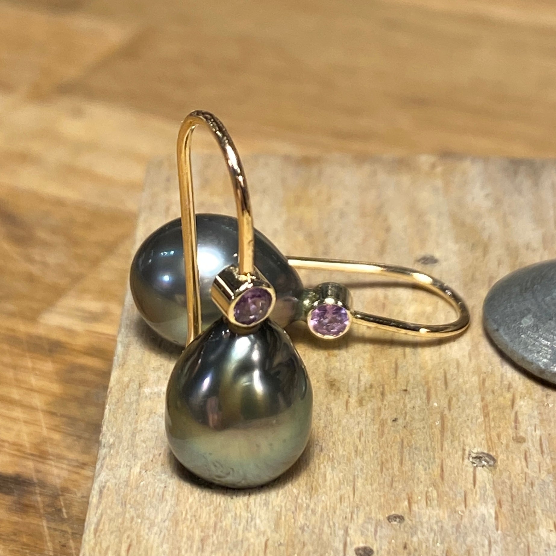 Ørekroge af 14 karat guld med dråbeformede Tahitiperler og 3 mm lilla safirer.
