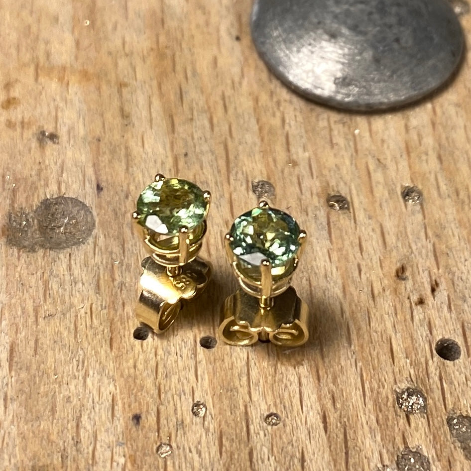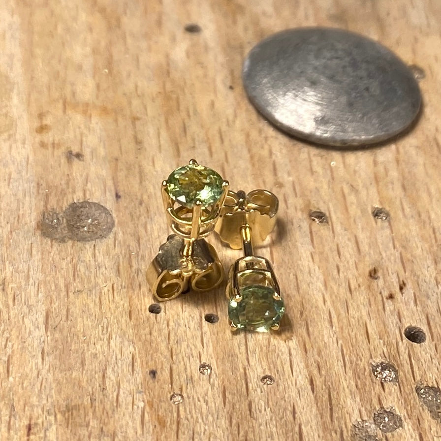 Guldørestikker med to forskellige grønne nuancer turmaliner. Stenene er facetterede og 5 mm i diamater