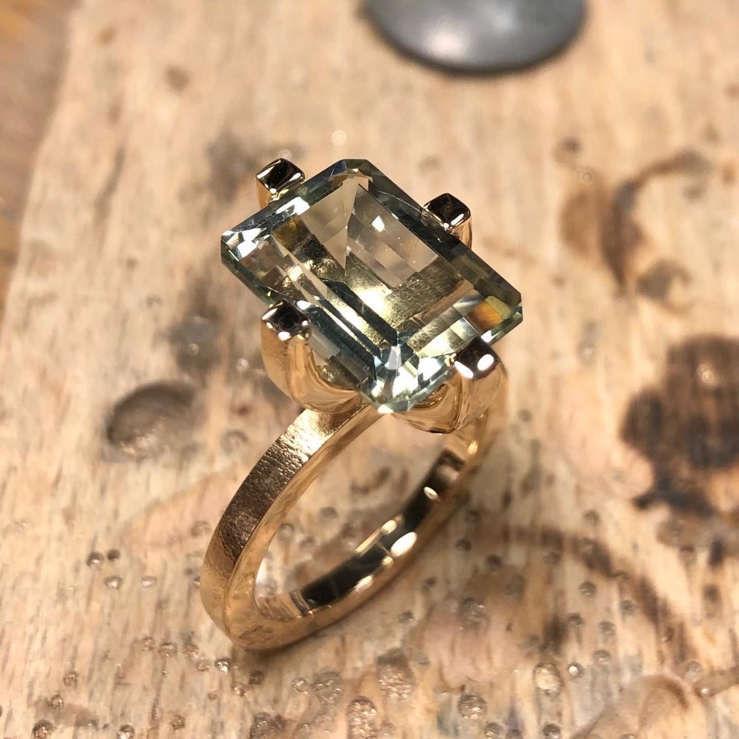 Guldring med rektangulær prasiolite. Prasioliten er 10x14 mm og er slebet i trappeslib.
