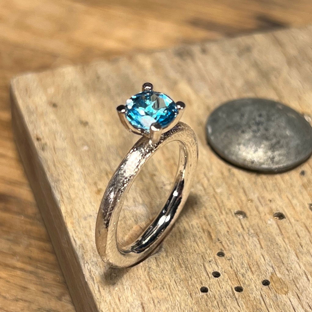 Sølvring 3 mm ringskinne med 7 mm facetteret Swiss Topas. Ringen er str 53.