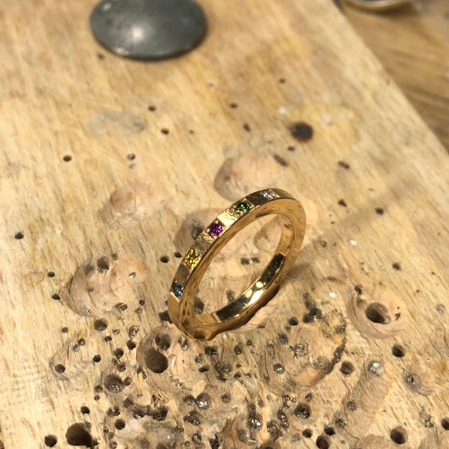 Guld alliancering a la K.Fjord. Ringen har 5 brillanter isat - 1 x 0,02 ct Skye Blue brillanter,1 x 0,02 ct Canary, 1 x 0,02 ct Green, 1 x 0,02 Pink og 1 x 0,02 ct. White brillanter TW/VVS. Ringen har ruflet overflade og blanke sider.