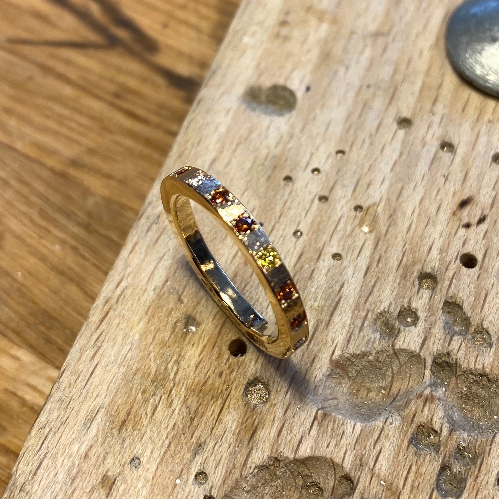 Alliancering a la K.Fjord - guldring med brillanter HELE VEJEN RUNDT. Der er 18 x 0,02 brillanter i farverne G/VVS, cognac og canary. Stenene sidder symetrisk hele vejen rundt efter princippet 2 cognac,1 canary, 2 cognac, 1 hvid, 2 cognac osv