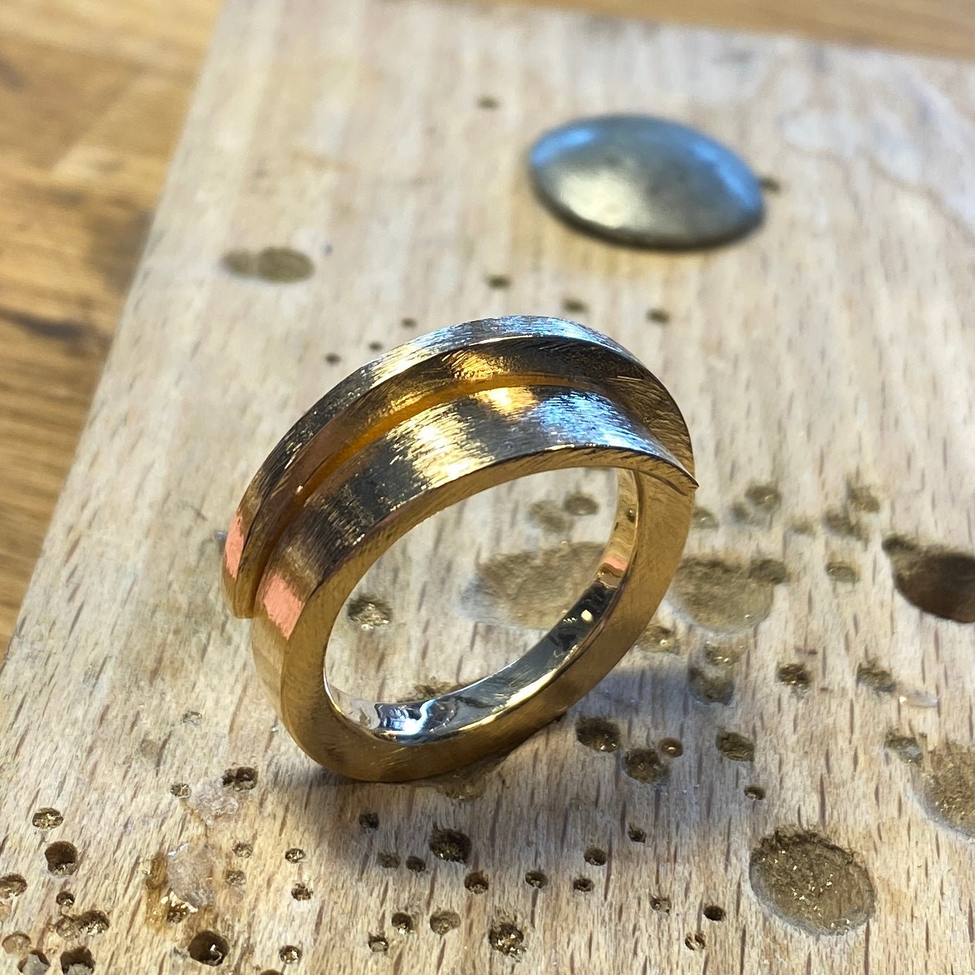 Håndsmedet guldring. Ringen har en rillet rå overflade.