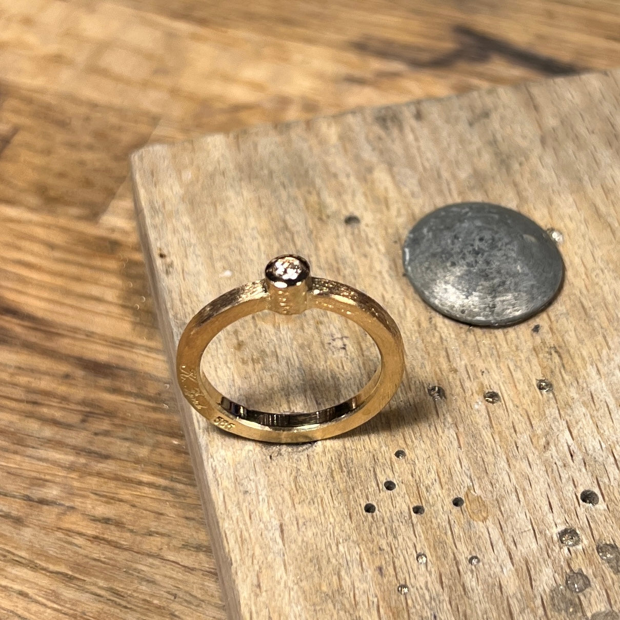 Guldring med 0.10 ct brillant. Ringen er str 57.