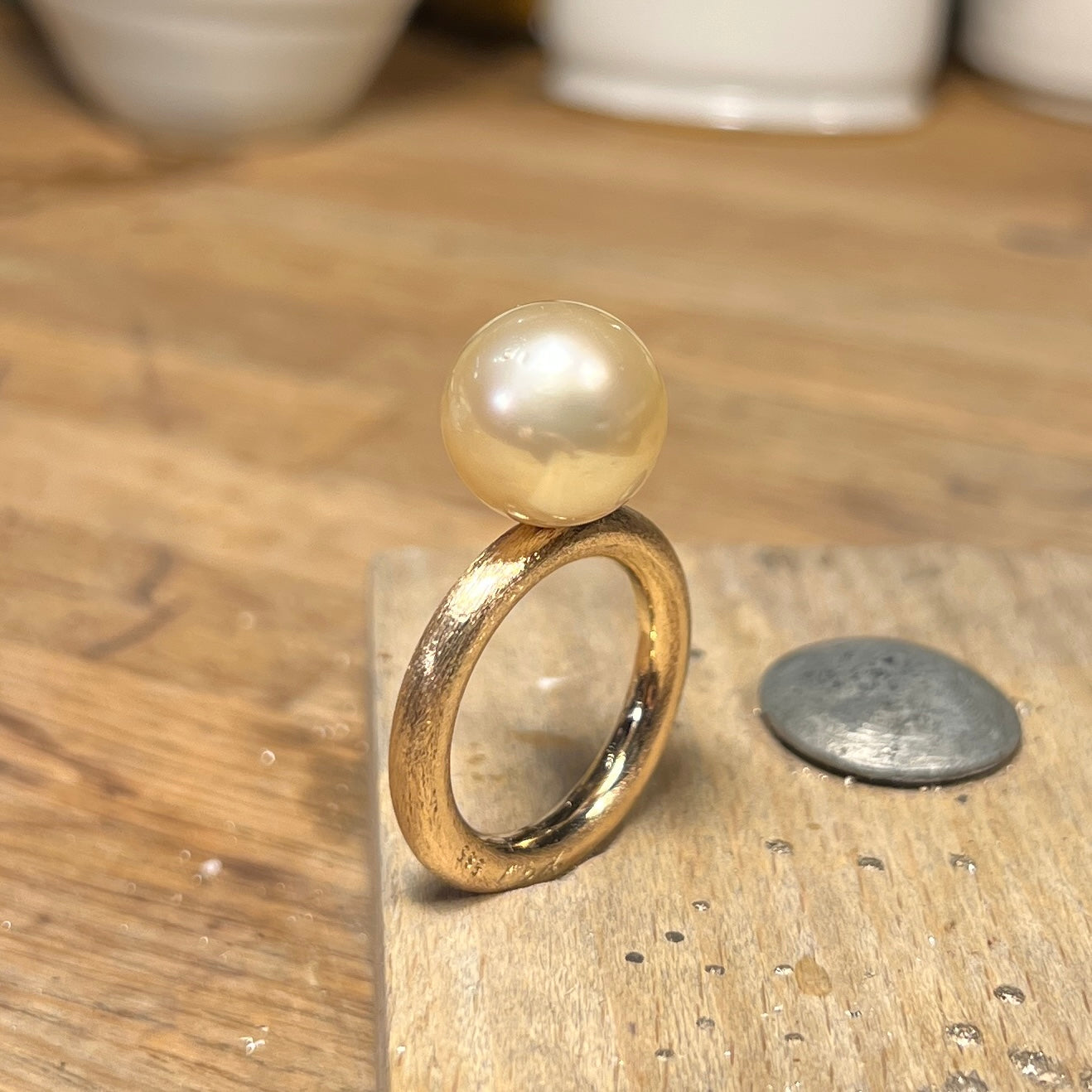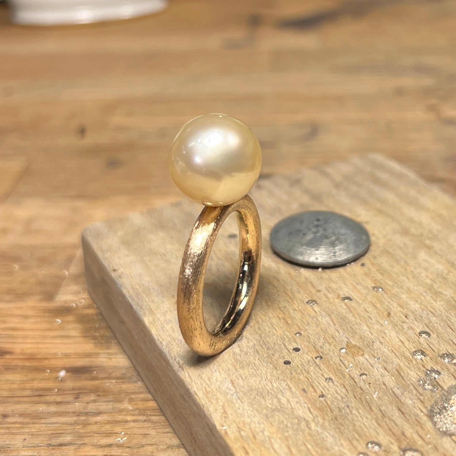 Rund guldring med 12 mm svag gul South Sea perle. Ringen er str 57