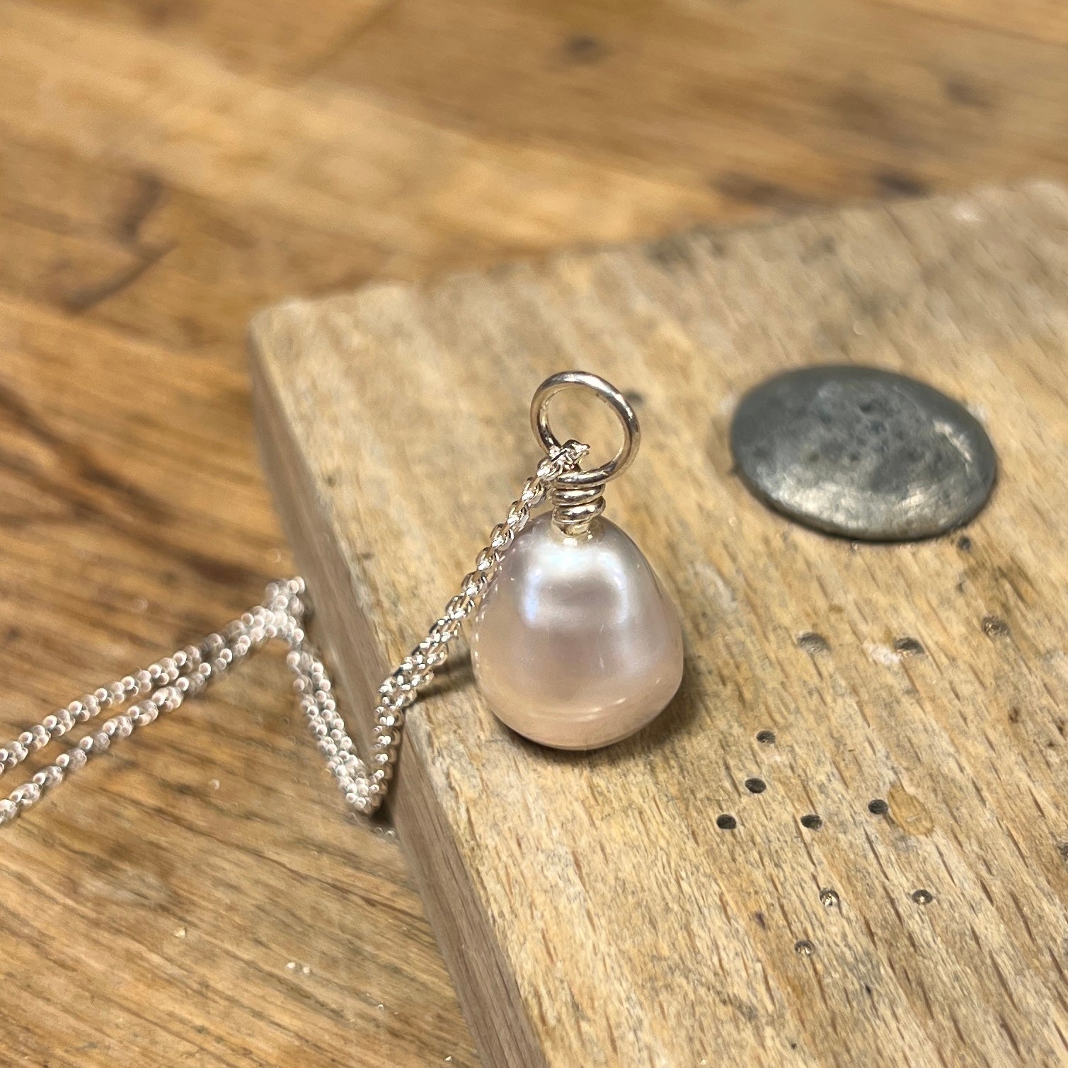 Perlevedhæng - ferskvandsperle 13 - 15,5 mm med Sterling Sølvophæng ex. kæde